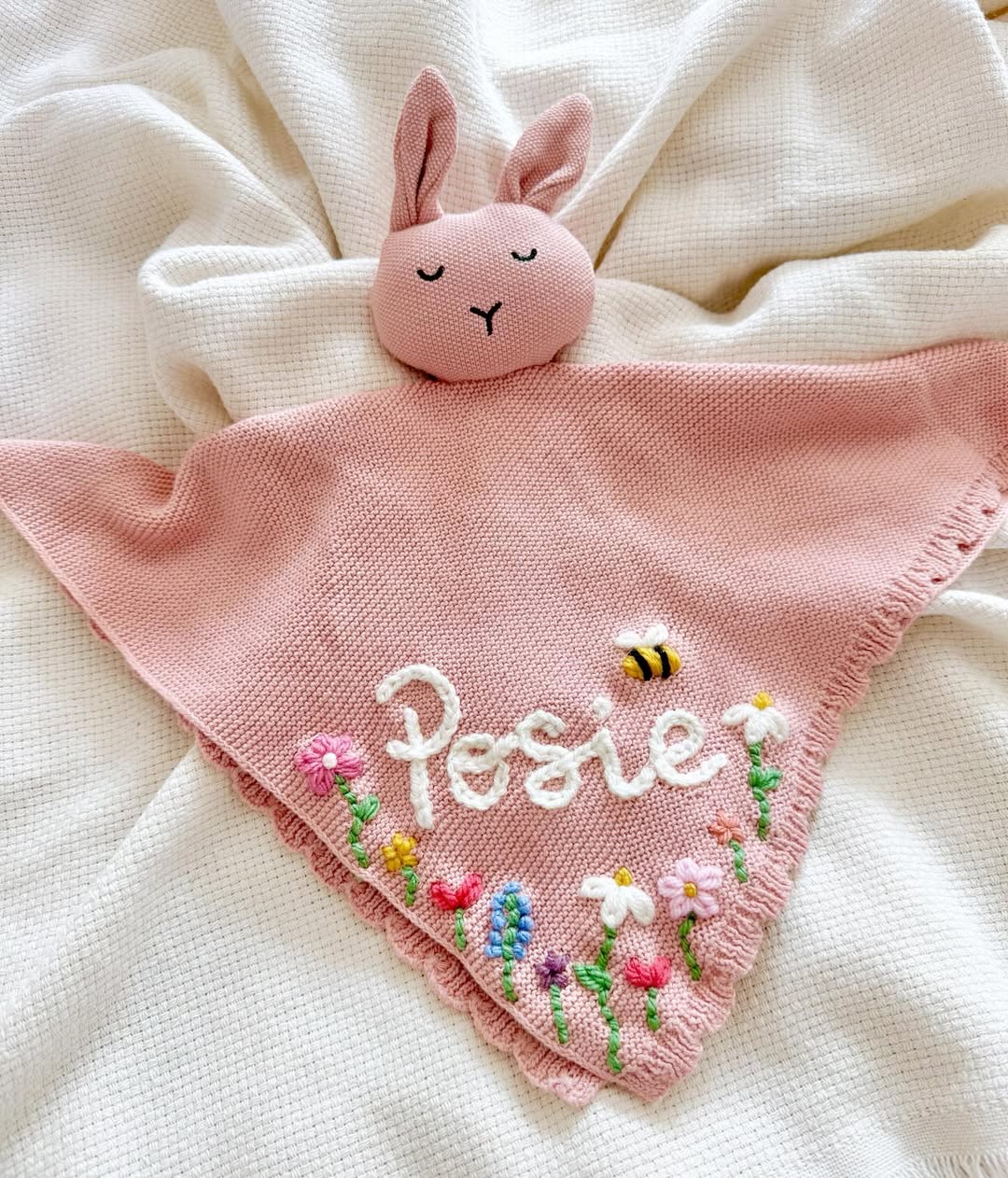 Blush knit keeps this comforter soft and nursery-sweet. The embroidered name pops in chunky ivory script across the center. A row of cheerful florals and a tiny bee add storybook charm along the edge. This is the kind of personalized lovey parents order twice—one for cuddles, one for backup.
