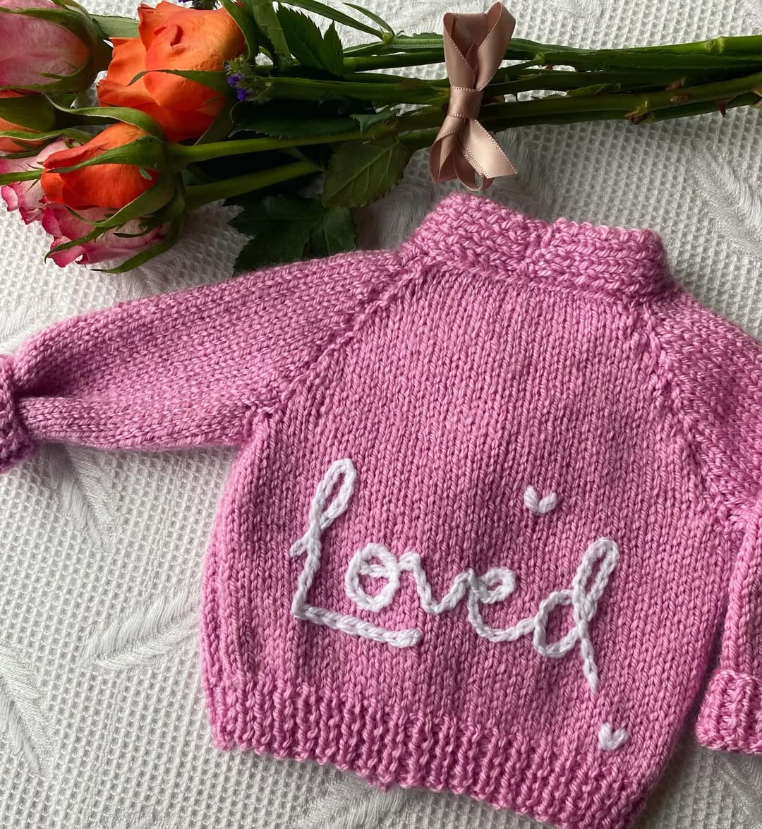 Bubblegum pink knit makes this sweater feel instantly giftable. The raised ivory embroidery adds bold texture that reads beautifully in photos. Tiny stitched hearts keep the look playful without overcomplicating the design. This is the kind of personalized knit that turns a simple name into a statement piece.