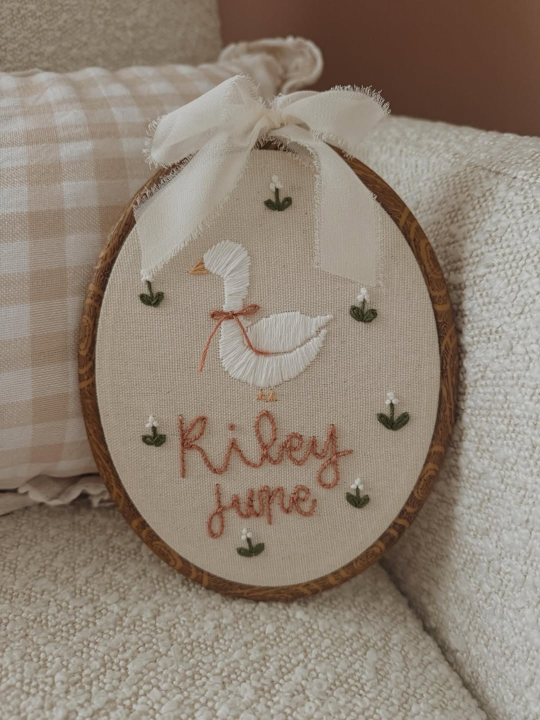 Soft linen and warm wood framing give this piece instant heirloom appeal. The stitched swan, tied with a dusty rose bow, feels straight out of a vintage nursery rhyme. Muted terracotta lettering keeps the personalization gentle and cohesive. Hang this above a crib and the whole room suddenly feels calmer.