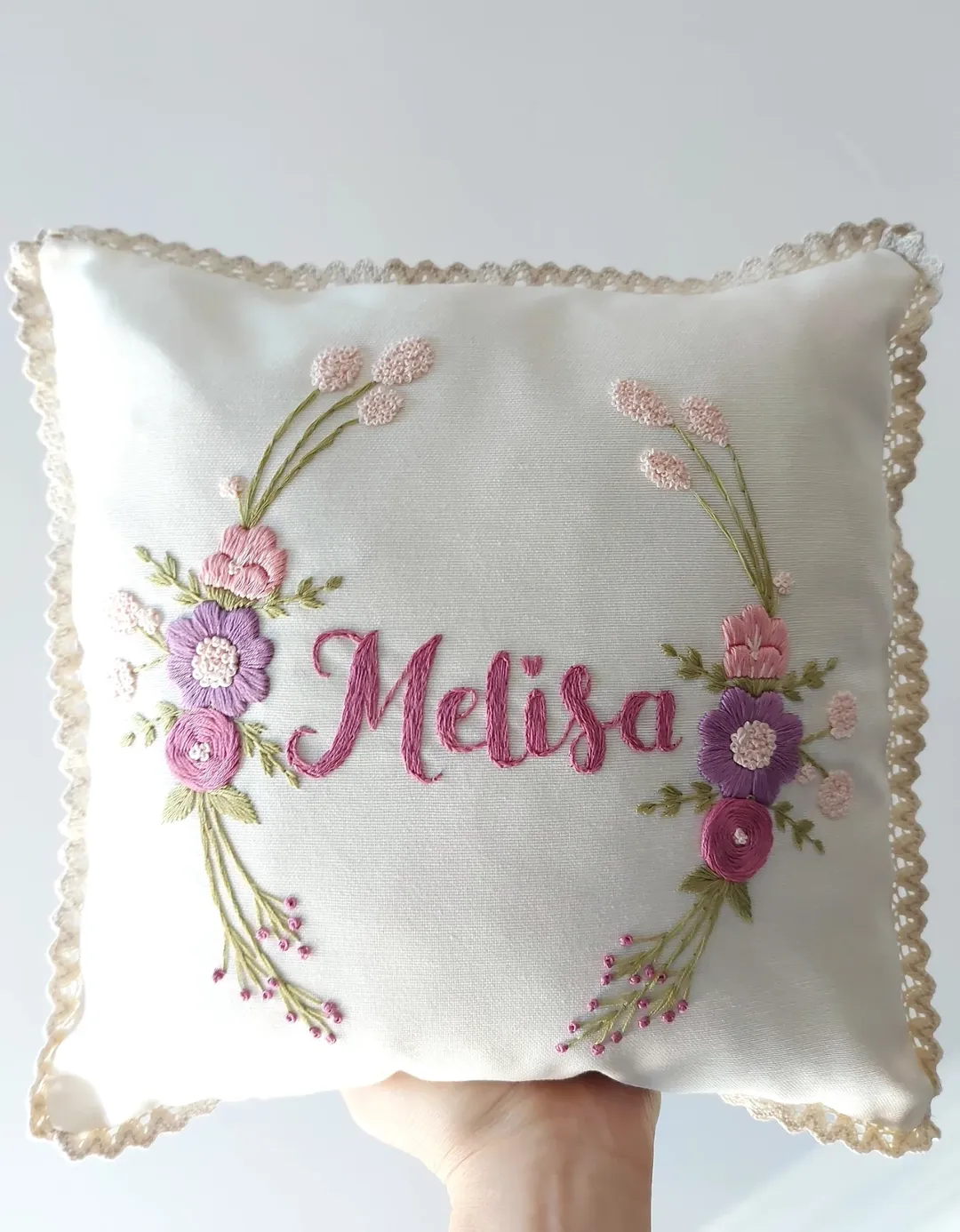 Cream satin gives this pillow a soft, keepsake-worthy glow. The embroidered name sits at center, surrounded by a wreath of blush and violet blooms. Textured stitches add depth, turning each flower into a tiny focal point. Finished with delicate lace edging, this is the kind of personalized cushion made for nursery shelves and christening gifts.