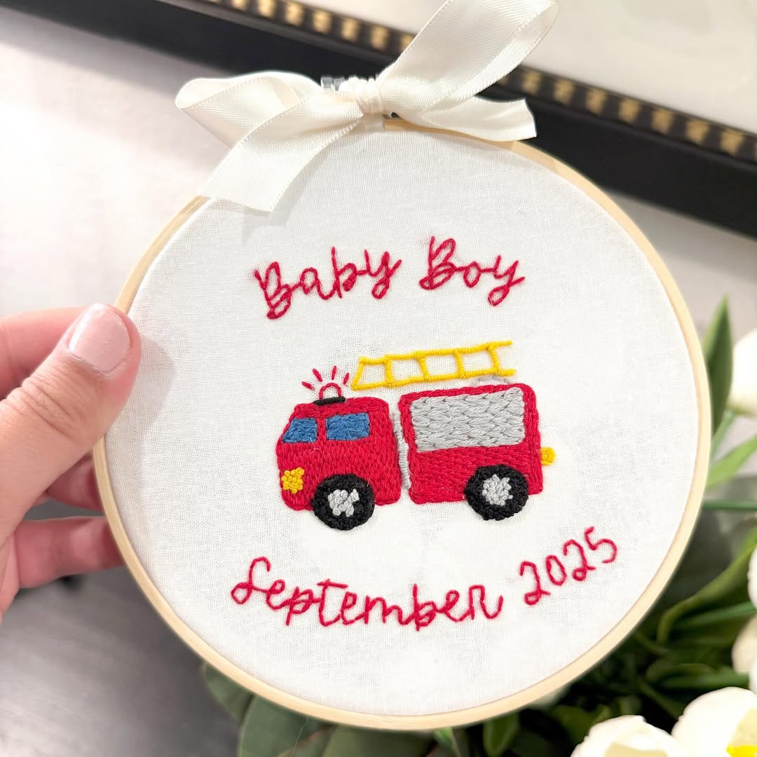 Crisp white linen keeps this hoop clean and modern. The bright red firetruck steals the spotlight with bold satin stitching and playful detail. Scripted text above and below frames the design like a birth announcement in thread. Add a date, and you’ve got a keepsake parents will hang long after the nursery phase.