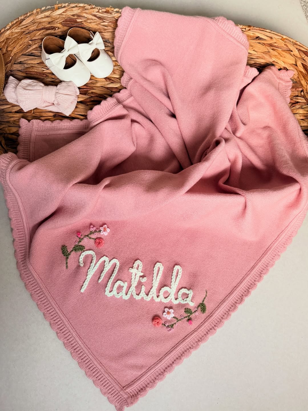 Dusty rose knit sets the sweetest stage here. The name is stitched in chunky ivory script, which gives the blanket a handmade, heirloom feel buyers love. Tiny embroidered florals add just enough charm without overwhelming the design. This is the kind of personalized baby blanket that sells itself at markets—soft, sentimental, and gift-ready.