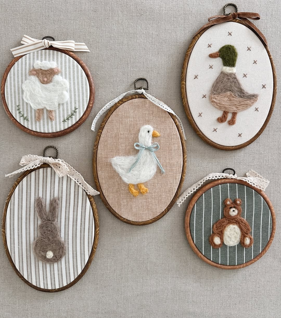 Neutral linen backdrops let the textured animals take center stage. Each felted figure pops against striped or solid fabric, adding subtle pattern without chaos. Warm wood hoops and lace bows lean vintage in the best way. Sell them as a mix-and-match nursery set, and suddenly one hoop turns into five.