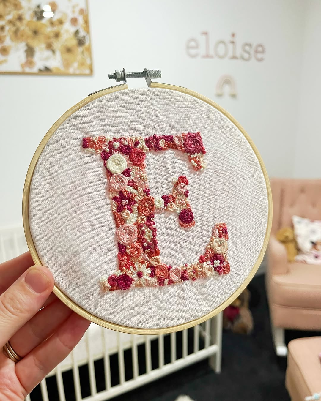 Natural linen keeps the background soft and understated. The oversized initial is completely built from layered rosette stitches in blush, coral, and cream. Dense embroidery gives the letter sculptural depth that feels almost three-dimensional. This is the kind of personalized hoop that anchors a gallery wall all on its own.