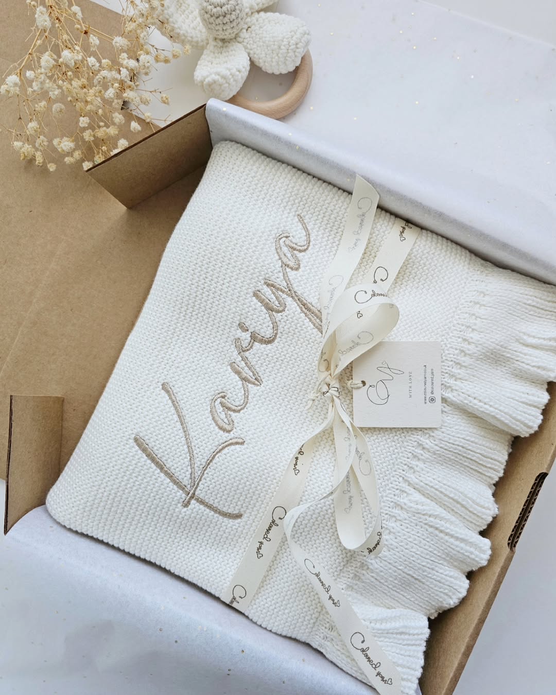 Soft ivory knit sets a calm, luxury tone right out of the box. The name is embroidered in a subtle taupe script that feels refined, not flashy. Ribbed ruffle edging adds just enough detail to keep it special. Package it with tissue and ribbon like this, and it becomes an instant premium baby shower favorite.