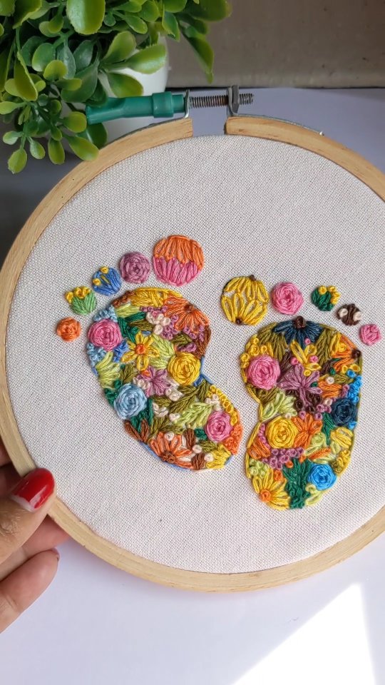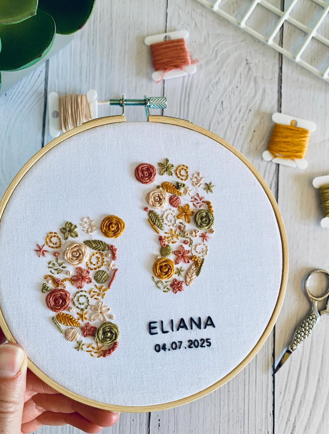 Neutral linen keeps the background calm and gallery-worthy. The baby feet are built entirely from layered florals, which turns a sweet motif into a textured showpiece. Earthy threads in rust, olive, and blush give it that modern nursery palette parents love. Adding the name and birth date makes this hoop an instant heirloom order.