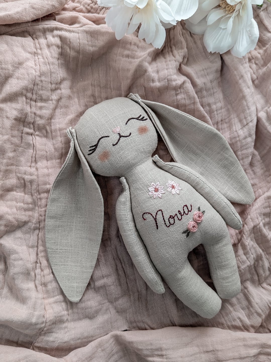 Soft linen fabric gives this bunny a gentle, heirloom quality. The embroidered name curves across the belly, turning a simple plush into something deeply personal. Tiny floral details add just enough charm without overwhelming the neutral palette. This is the kind of keepsake toy parents tuck into memory boxes years later.