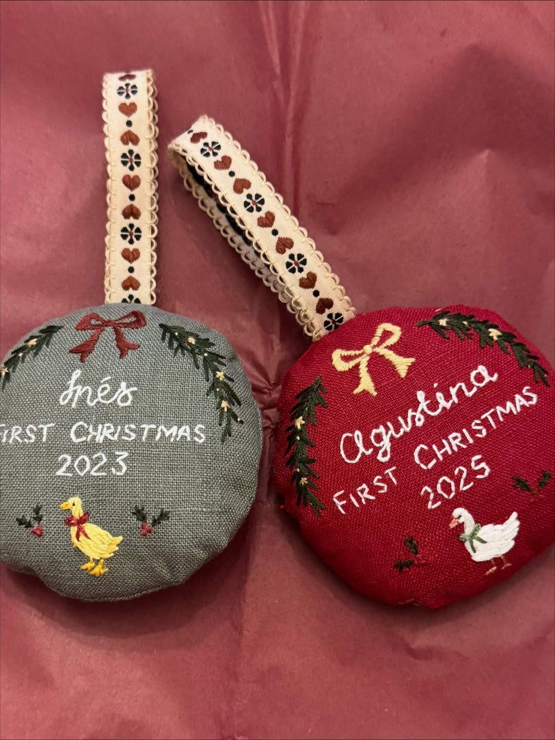 Rich linen in deep red and sage sets a nostalgic holiday tone. Delicate evergreen garlands and tiny bows frame each name like a wreath. The embroidered date makes it a time capsule in ornament form. Add the patterned hanging ribbon and it feels straight off a countryside tree.