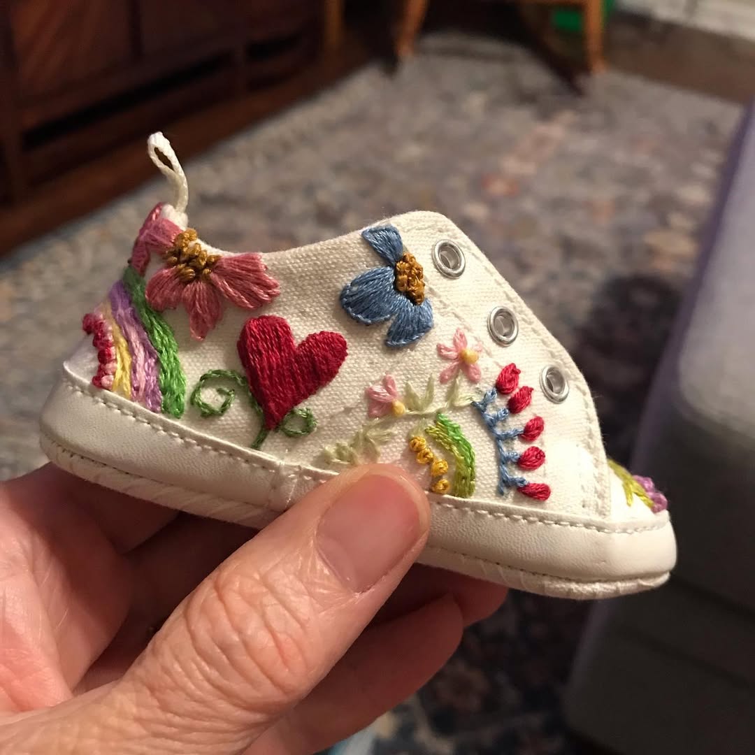 Classic white canvas keeps the base clean and versatile. The hand embroidery bursts across the side in bold florals, a bright red heart, and playful rainbow detail. Each stitch adds texture, turning a basic baby shoe into wearable art. Offer custom color palettes, and this becomes the coolest first-step gift around.