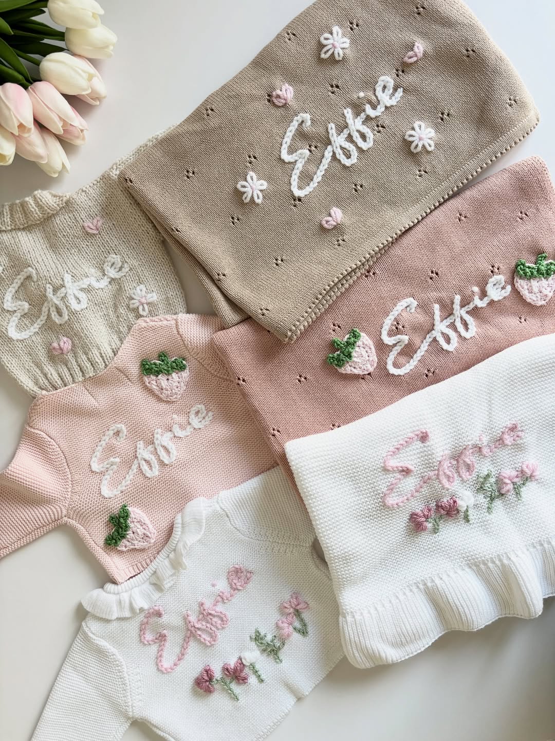 Muted blush, oat, and cream create the dreamiest backdrop for delicate hand embroidery. Raised script lettering gives each “Effie” a storybook feel, while tiny florals and textured strawberries add charm without overwhelming the knit. The mix of sweaters and blankets makes this perfect for curated sibling or newborn sets. Offer coordinated colorways and it instantly becomes a boutique-ready, heirloom collection.