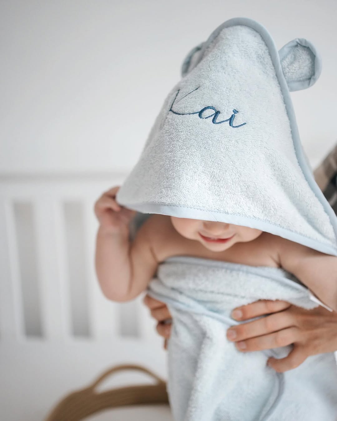 Powder blue terry wraps baby in cloud-soft comfort, finished with delicate piping for a polished touch. The bear-ear hood adds just enough whimsy, while the embroidered name turns bath time into a boutique moment. It’s practical, giftable, and irresistibly photo-ready. Offer this in multiple thread colors and you’ve got a keepsake towel parents will reach for every night.