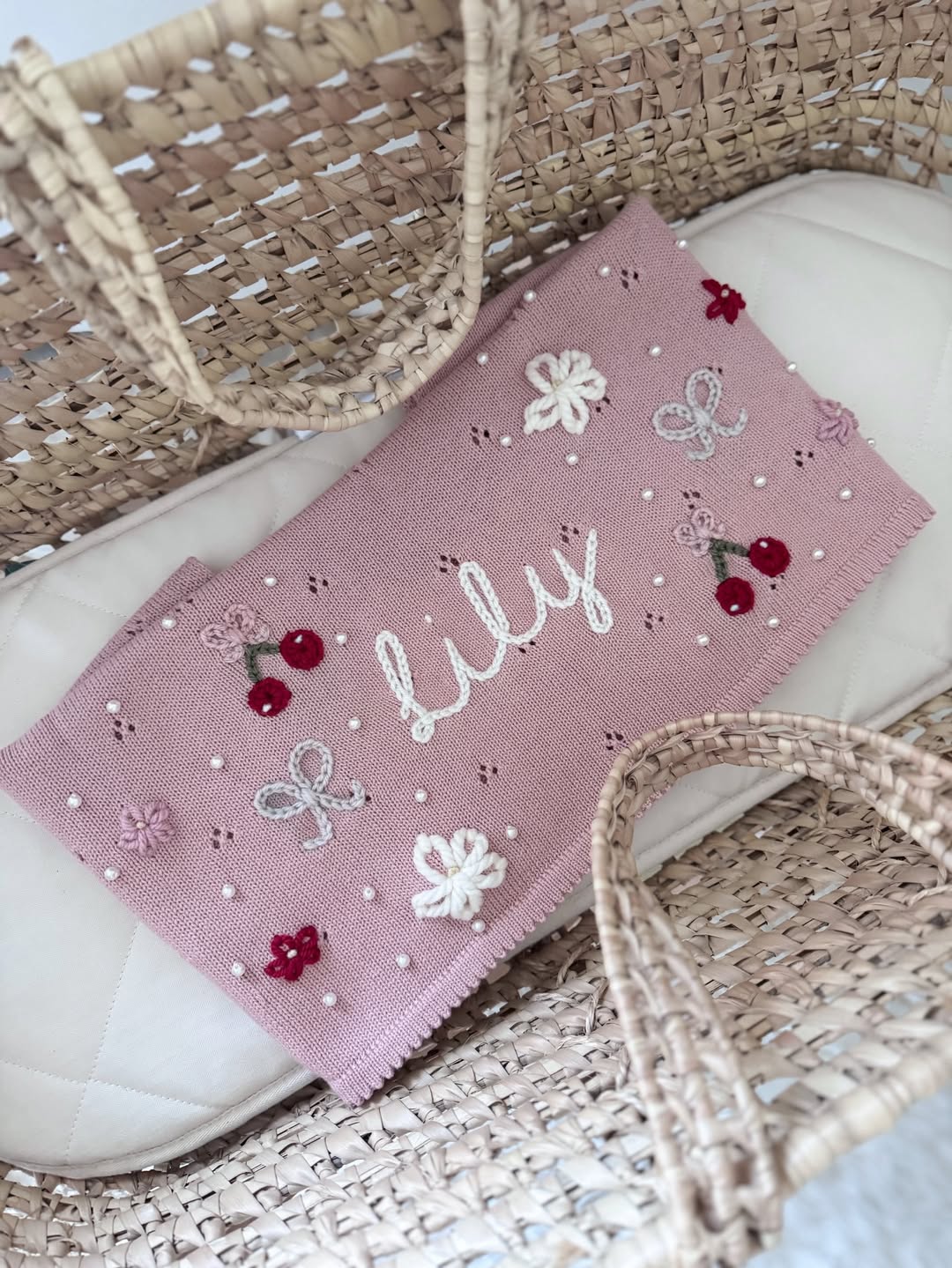 Dusty rose knit sets the tone for vintage charm, scattered with tiny pearls for that heirloom sparkle. Raised ivory script gives “Lily” a handcrafted, storybook feel, while embroidered cherries and delicate bows add playful detail. It’s feminine without being fussy — the kind of piece that elevates an entire nursery. Bundle with matching accessories and you’ve got a keepsake gift parents won’t forget.