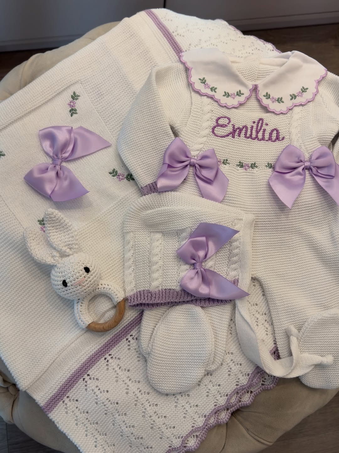 Cream knit and lilac trim make this set feel straight out of a christening daydream. The embroidered name across the chest turns a classic silhouette into a keepsake parents will box up forever. Satin bows add just enough drama to boost perceived value. Offer this as a full coordinated bundle and you’ve got a premium, gift-ready bestseller.
