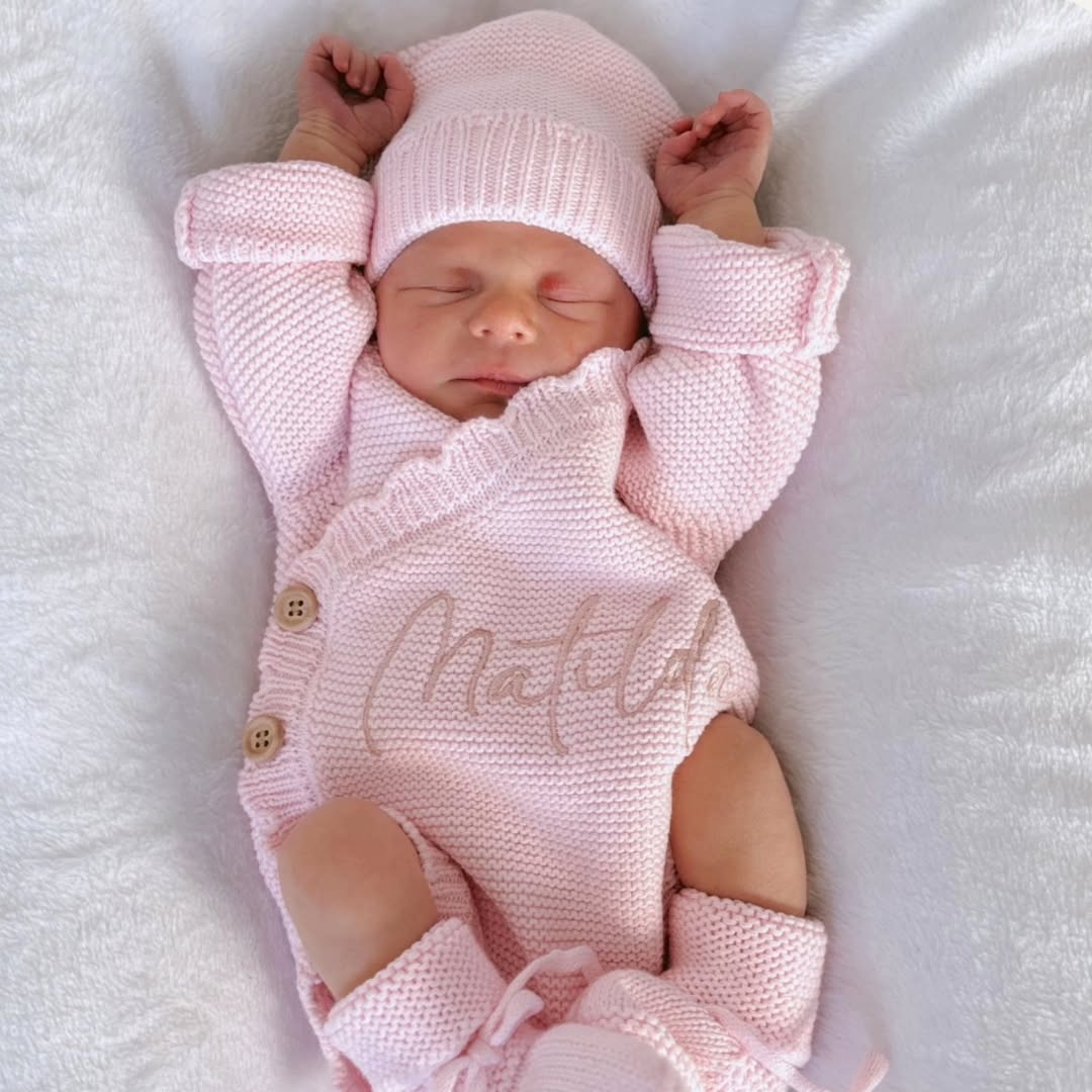 Soft pastel pink wraps baby in cozy comfort, complete with matching hat and booties for that perfectly styled first photo. The wrap-front design with wooden buttons adds a timeless touch, while the embroidered name turns a sweet outfit into a forever keepsake. It’s delicate, classic, and irresistibly giftable. Offer this as a coming-home bundle and it becomes a must-have for hospital bags and newborn shoots alike.