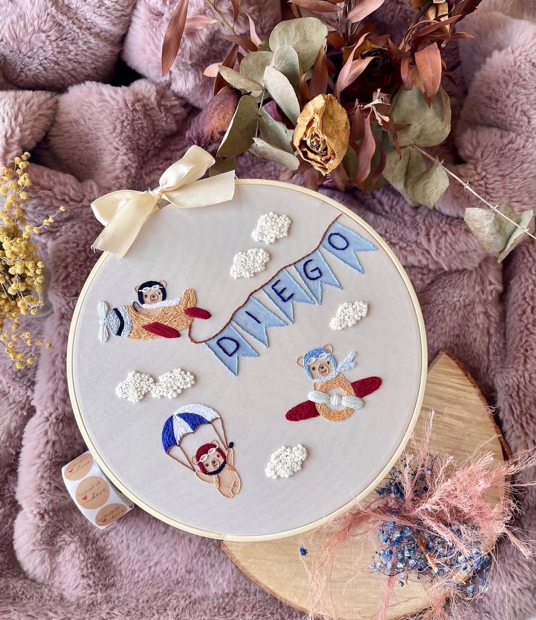 Soft neutrals keep the hoop feeling nursery-ready and timeless. The name stretches across a powder-blue banner, giving the composition a playful, celebratory arc. Tiny embroidered bears in planes and parachutes add motion and personality. This is wall art that doubles as a birth keepsake parents will happily commission.