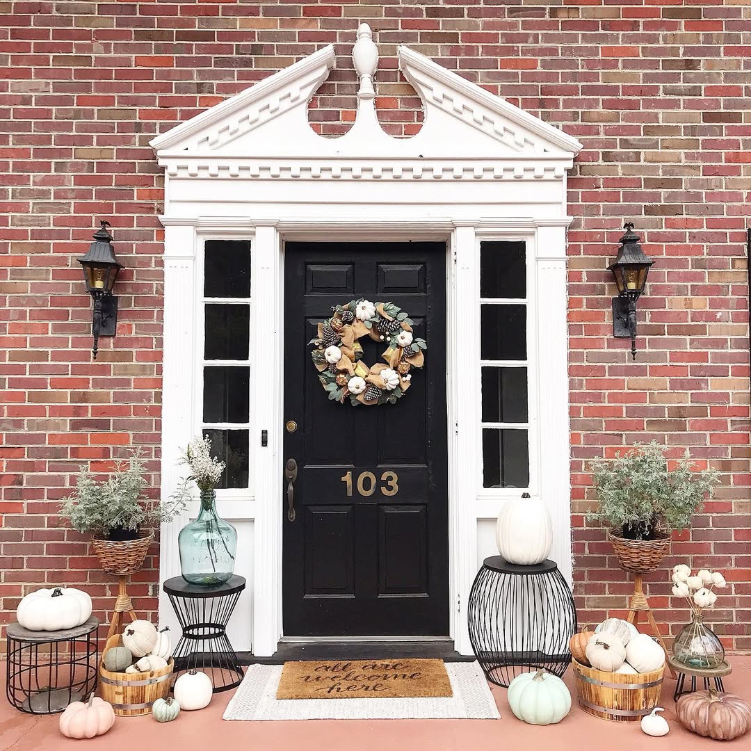 A black door framed by crisp sidelights and a showy pediment makes this entrance feel straight out of a period drama—but the styling keeps it playful. Cotton-filled wreath, white pumpkins, and woven textures bring a soft, farmhouse-meets-urban vibe to the brick backdrop. Layered stools and glass jars give height and interest without clutter. And that welcome mat? Just the right amount of cheeky charm to balance the symmetry.