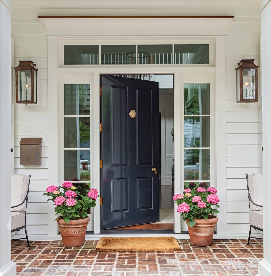 Brick flooring and crisp white siding set a classic stage, but that glossy navy door steals the spotlight. Polished brass hardware and a pineapple knocker give it just enough preppy polish. Twin terracotta pots filled with hot pink hydrangeas add a cheery jolt of color—welcoming, but not trying too hard. French sidelights and transom windows keep things bright and symmetrical, no matter how wide the door swings open.