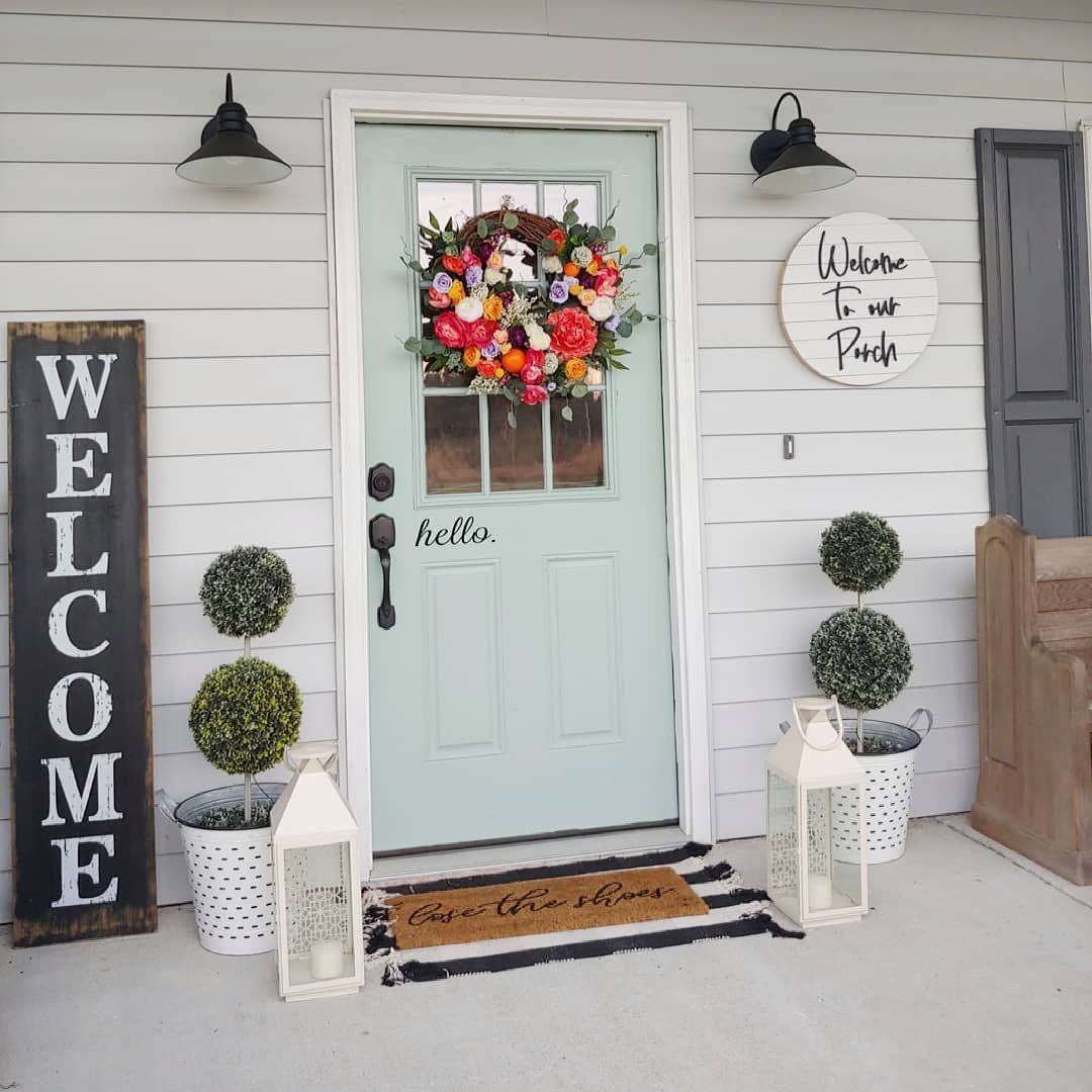 Mint green makes the friendliest first impression—especially paired with a riot of faux florals on the door. Layered doormats and oversized lanterns give the setup texture without adding clutter. Playful typography (“hello.” and “lose the shoes”) leans into a casual, lived-in vibe. Even the topiary twins feel more fun than formal, like they’re in on the welcome party.