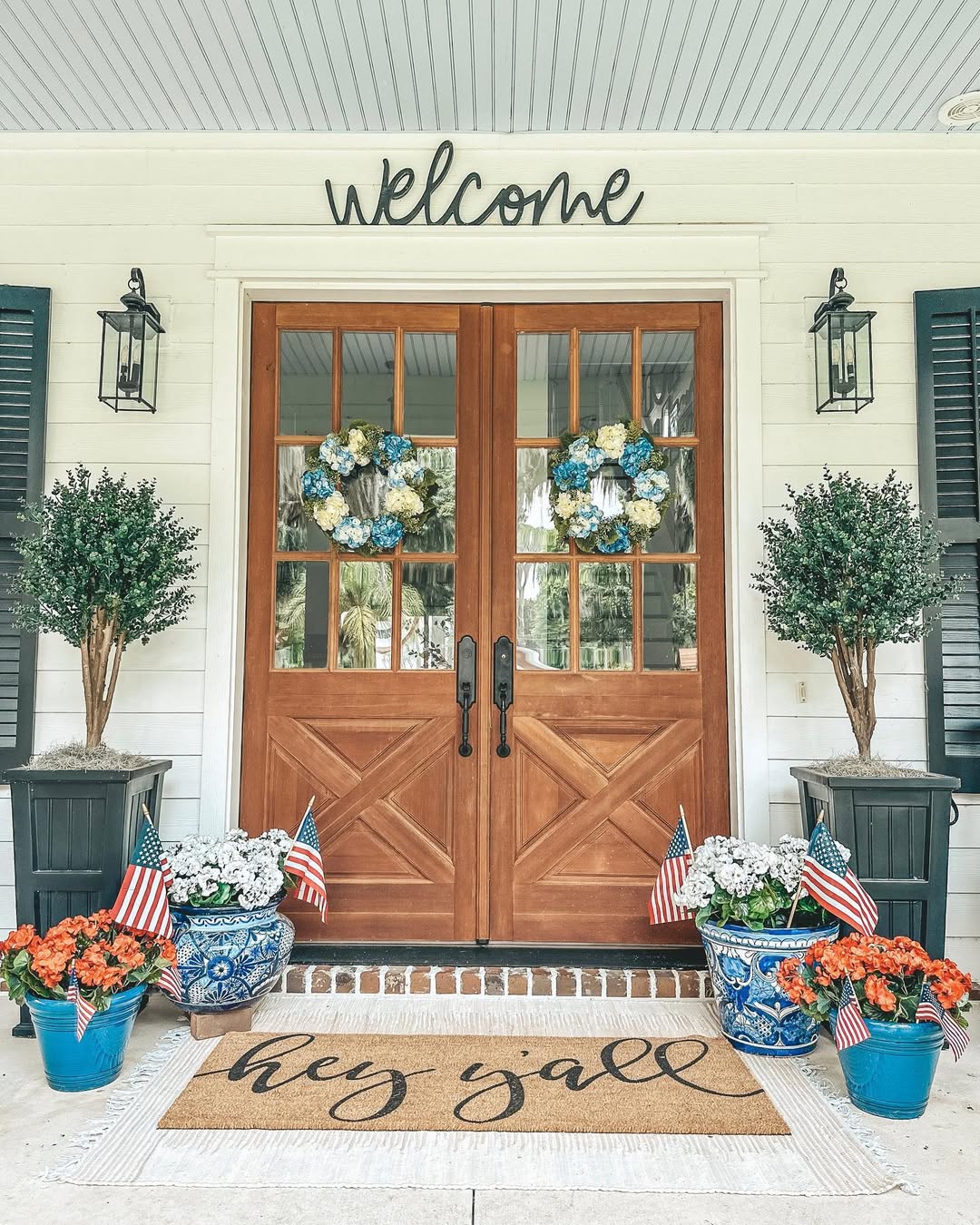 Wooden double doors bring warmth and classic Southern charm, especially when flanked by twin box planters and patriotic pops of red, white, and blue. Hydrangea wreaths echo the porch’s cool tones, tying in with the painted ceiling and blue ceramic pots. A layered doormat says “hey y’all” like it really means it. From the lanterns to the symmetry, every detail feels equal parts polished and playful.