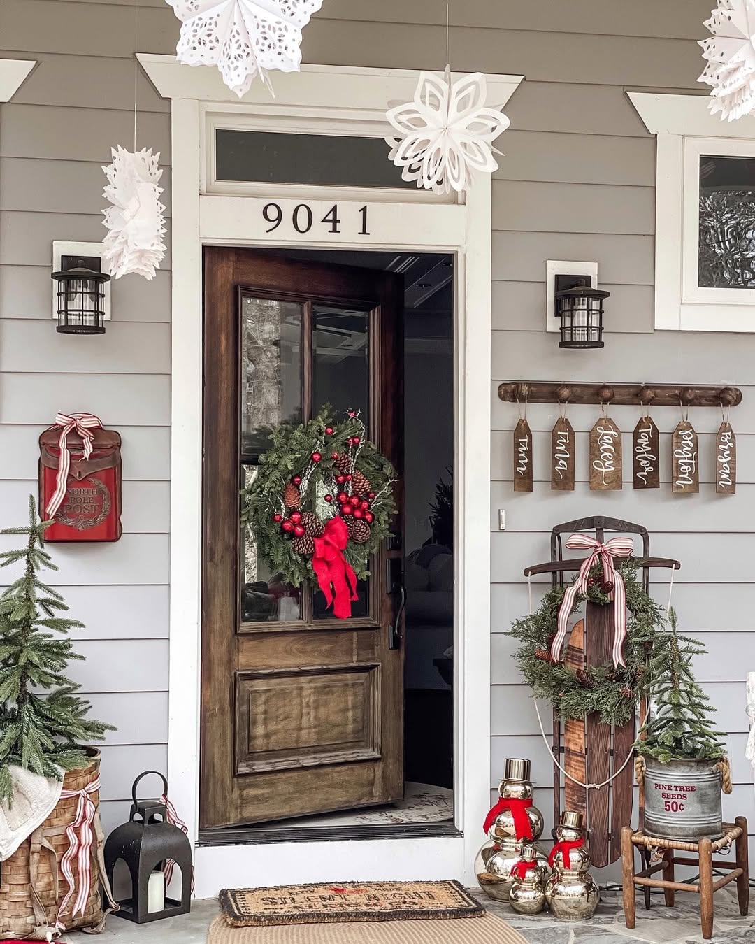 Wood tones and soft gray siding create a cozy base, but the real magic is in the holiday layering. Hanging paper snowflakes float above a nostalgic mix of vintage sleds, metallic snowmen, and striped ribbons galore. A bright red mailbox and jingle-bell wreath amp up the North Pole energy without feeling overdone. Every corner is styled with intention—and just enough whimsy to make you believe.