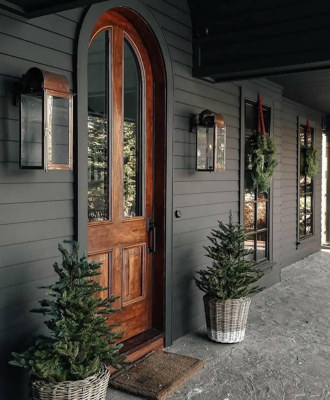 Charcoal siding and copper lanterns set a dramatic tone, but it’s the arched wood door that anchors everything with warmth. Basketed evergreens add a soft, rustic layer that echoes the alpine vibe. Simple wreaths in the windows keep the look festive without breaking the cool, collected palette. No garland, no bows—just a quiet kind of holiday magic.