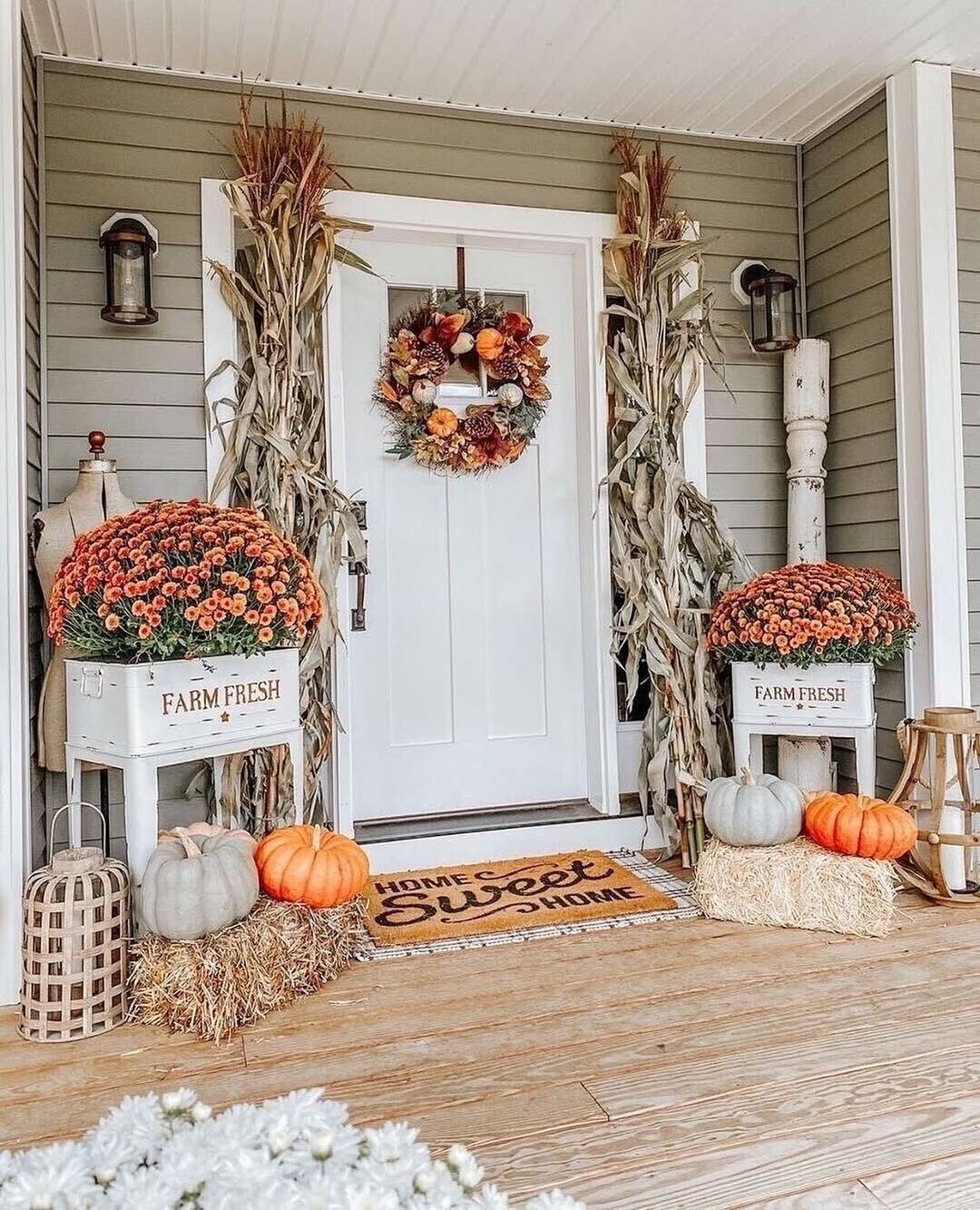Autumn energy is full throttle here, and it’s delightful. Stalks of dried corn frame the white door like nature’s curtain rods, while mounds of orange mums perch atop “Farm Fresh” stands for extra farmhouse flair. Pumpkins, straw, and wood lanterns fill out the vignette without feeling crowded. Even the wreath pulls its weight—bold, textured, and perfectly on-theme.