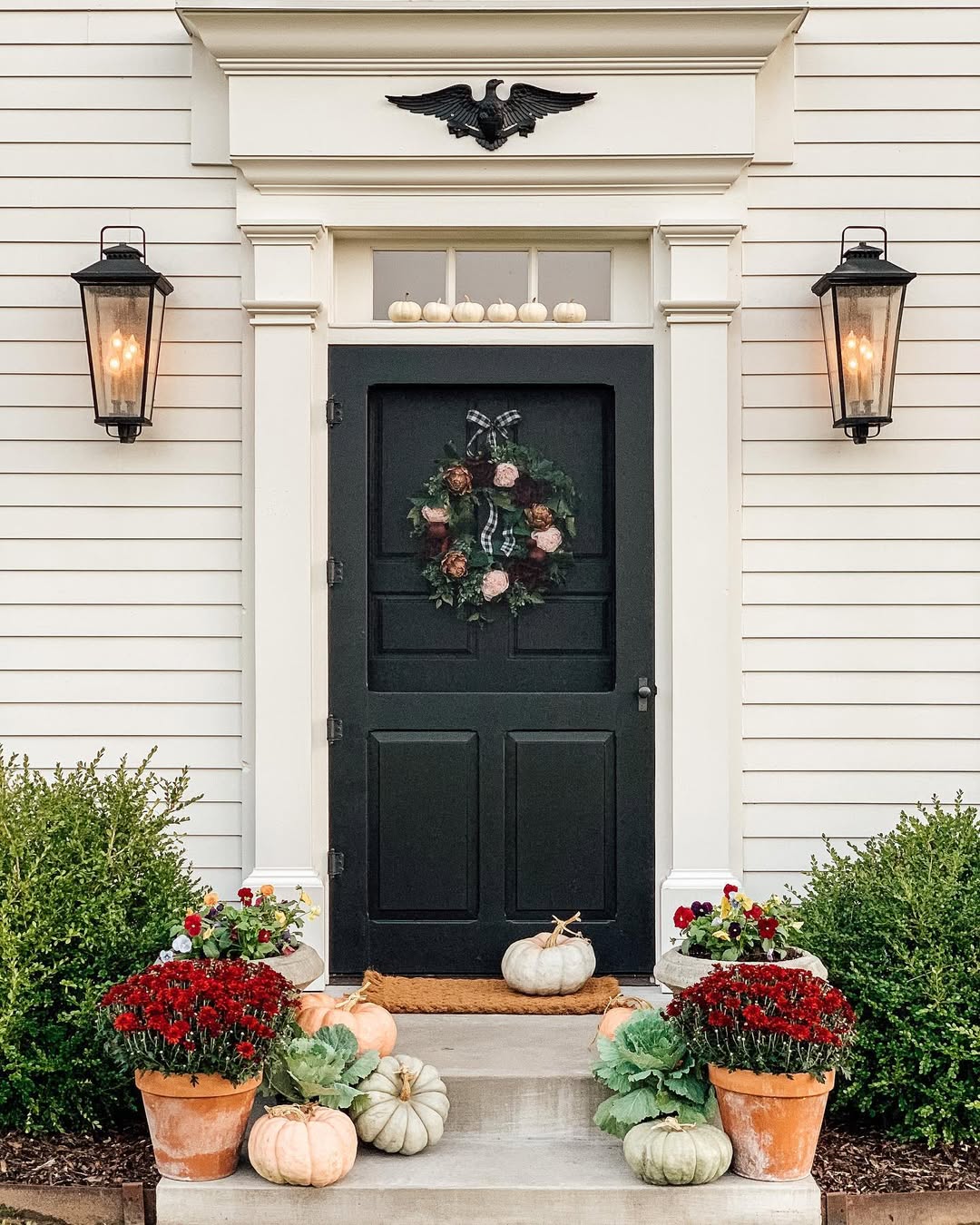 Skip the overdone hay bales—this farmhouse entry keeps it clean and classic. The dark Dutch door pops against crisp siding, while oversized lanterns and mini white pumpkins add colonial charm. Terracotta pots packed with mums and cabbage flank the steps like a fall welcome crew. And that plaid ribbon on the wreath? A subtle nod to cozy season without going full scarecrow.