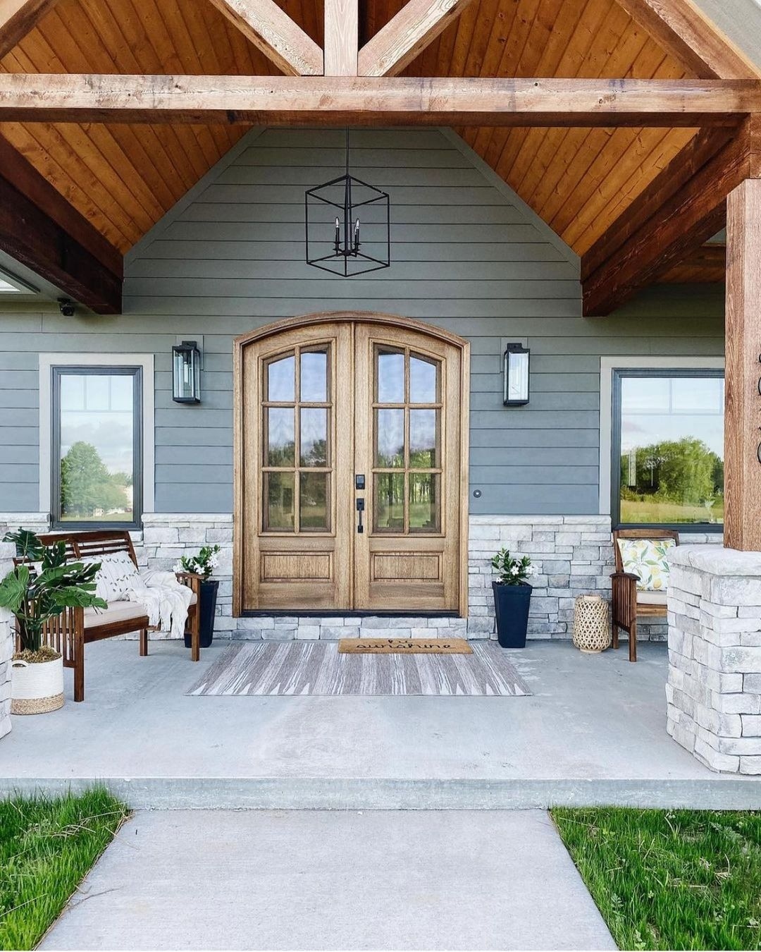 Arched double doors in warm wood bring instant presence, balancing the cool-toned siding and stonework with rustic ease. Exposed beams overhead echo the natural textures, while the geometric pendant adds a modern contrast. Clean-lined benches, leafy planters, and layered rugs keep the entry feeling lived-in, not overly styled. It’s giving upscale cabin—minus the mountain commute.