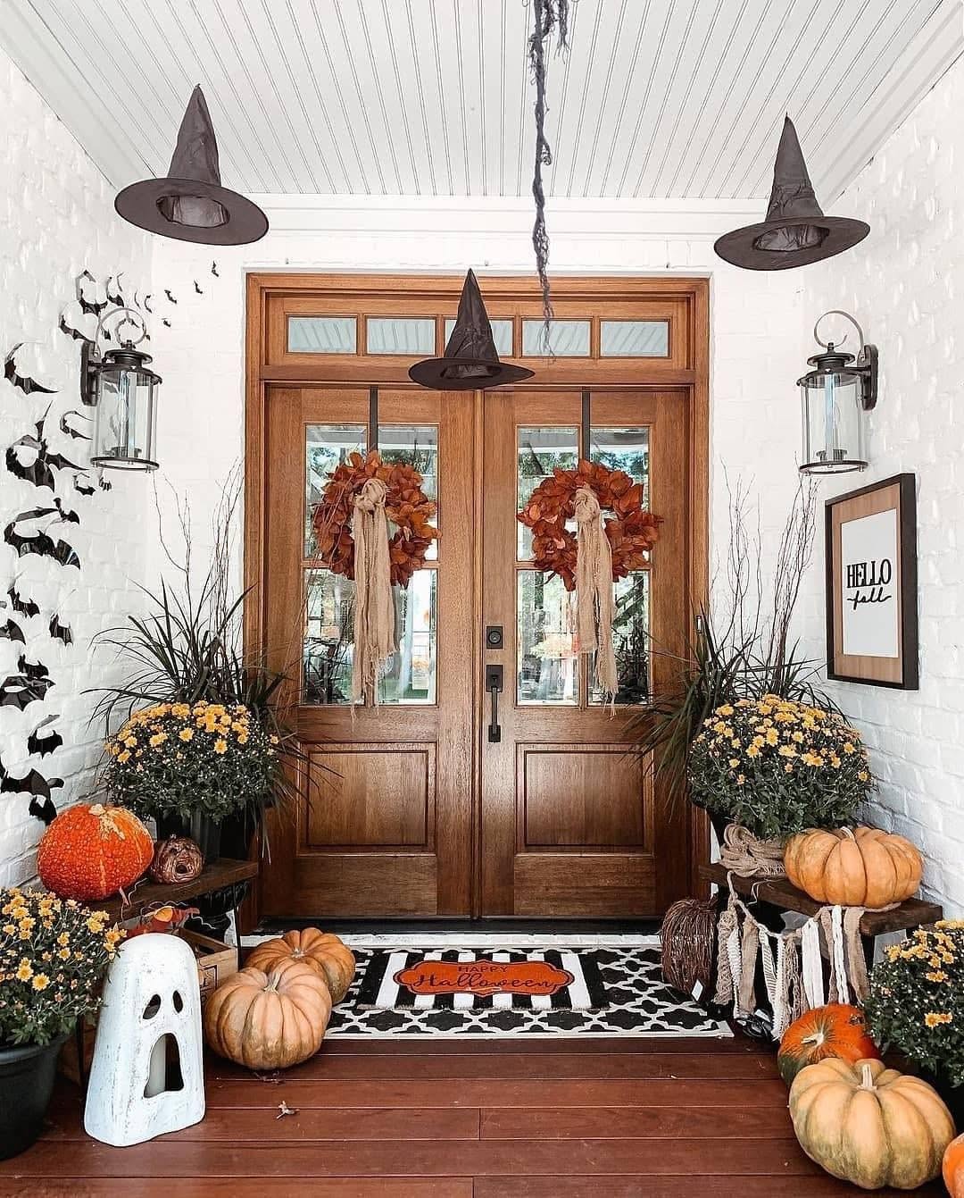 Floating hats, trailing scarves, and moody wreaths turn this porch into Halloween’s most stylish haunt. Warm wood double doors soften the spooky, playing well with layered rugs and playful signage. A swarm of bats climbs one wall while mums, pumpkins, and ghost decor fill the floor with cozy creepiness. It’s all treats, no tricks—just the right amount of eerie energy.