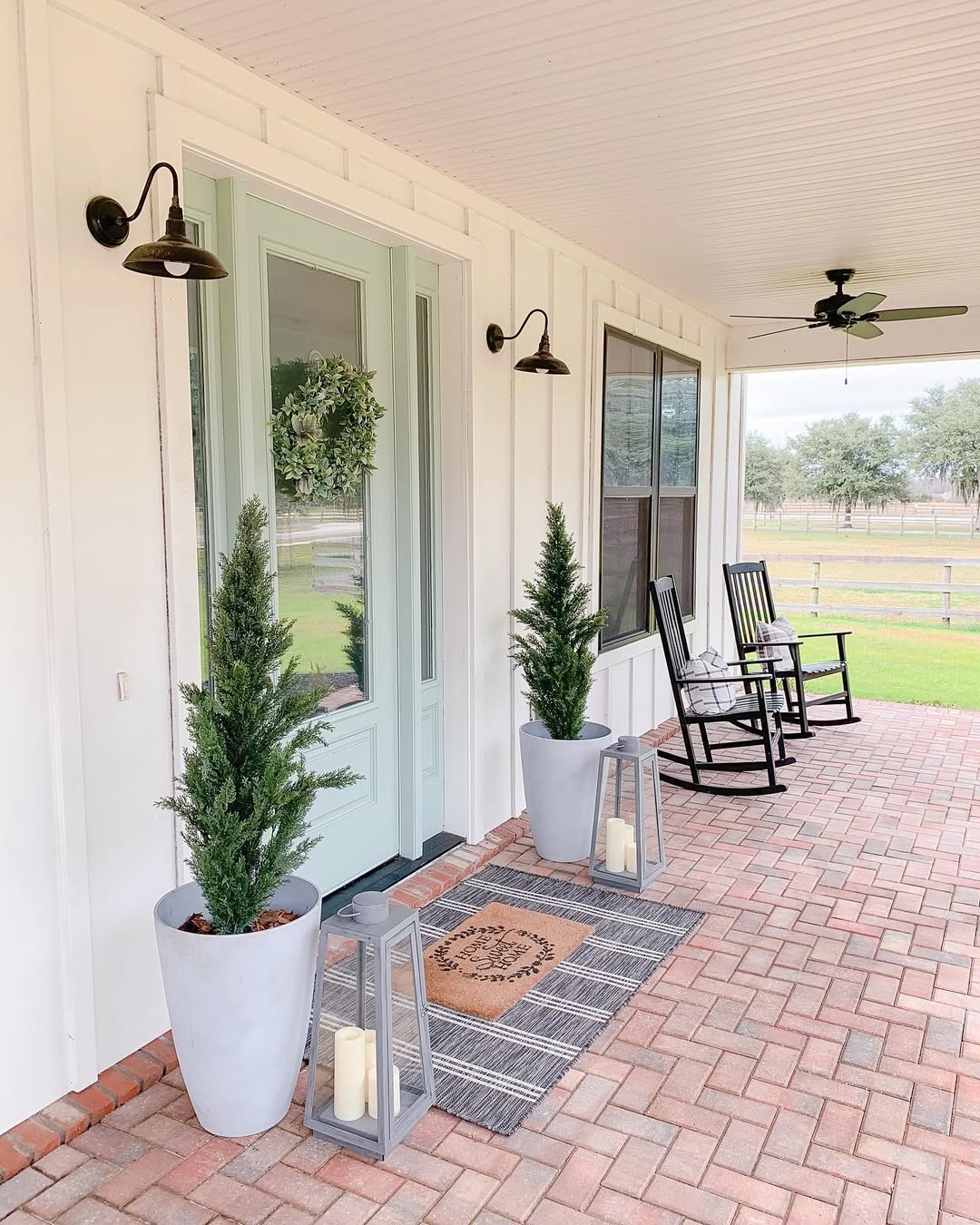 Soft sage green steals the spotlight in a sea of clean white board-and-batten. Oversized planters with evergreens flank the door for a structured, symmetrical welcome. Layered rugs and lanterns keep the look cozy but streamlined—no hay bales or pumpkins in sight. Rocking chairs seal the country-chic deal, ready for slow mornings and sweet tea moments.