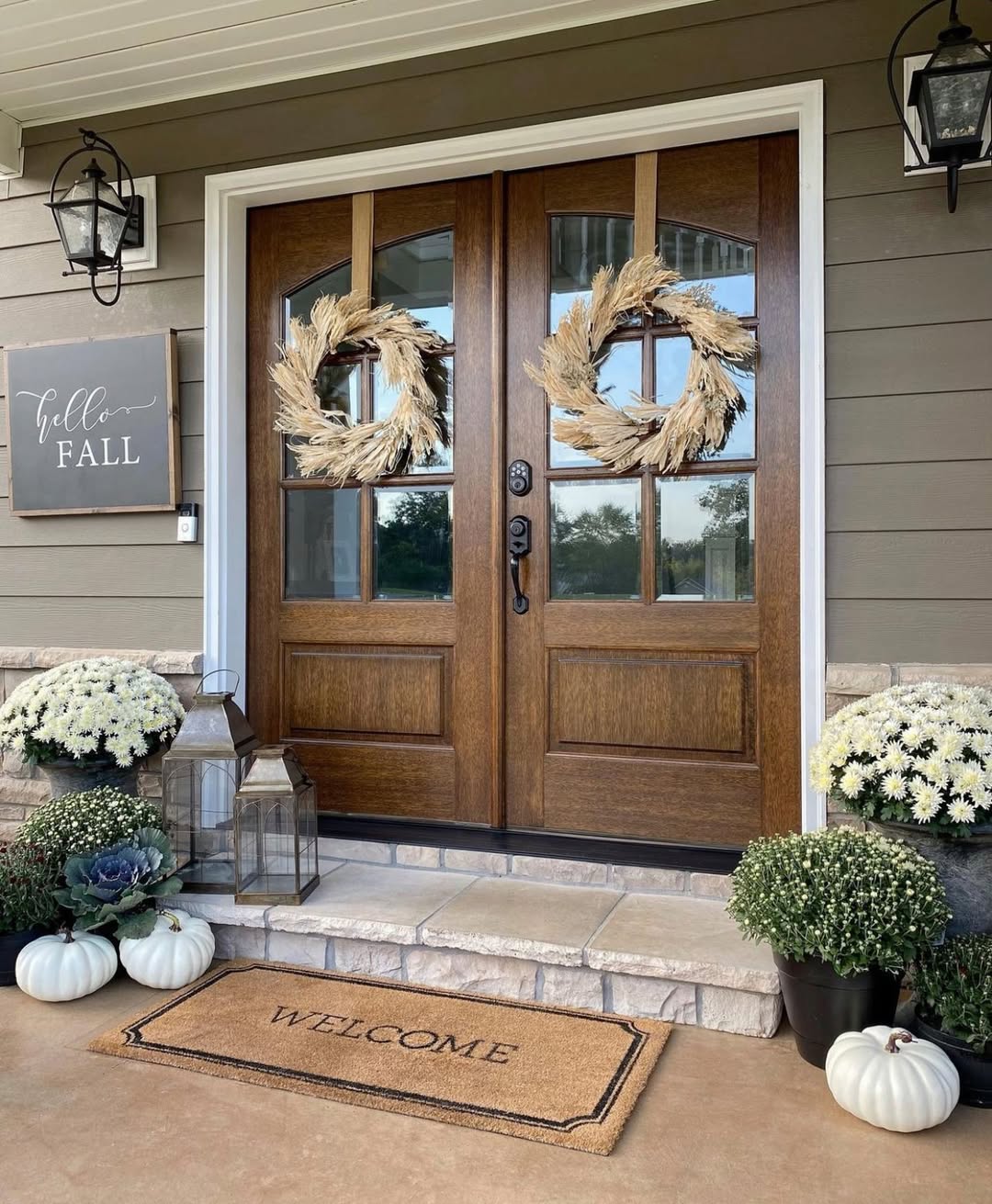 Grainy wheat wreaths set the tone for a fall-forward entry, playing beautifully against the wood tone of the double doors. Soft yellow mums and pale pumpkins stay within a muted palette, while lanterns add glow without going full Halloween. A simple “Hello Fall” sign nails the seasonal message without overpowering the scene. Subtle, balanced, and easy to recreate.