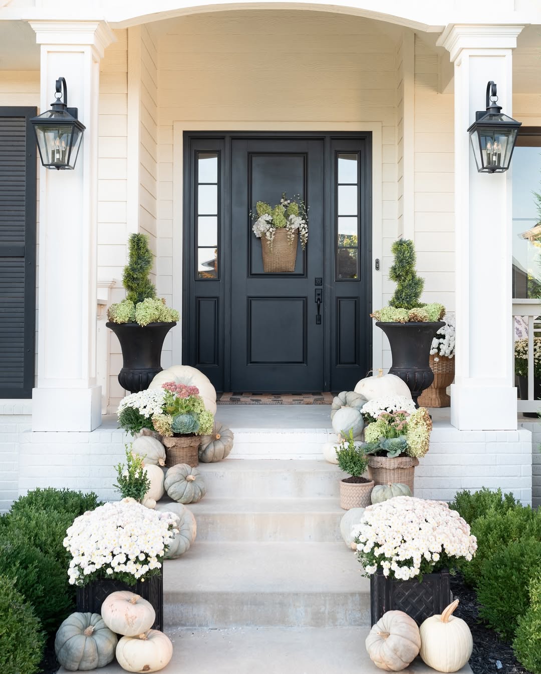 Black front doors and urns bring high contrast, but it’s the layering of texture that really elevates the look. Pale pumpkins, cabbage planters, and white mums cascade down the steps like a floral runway. Even the woven basket on the door gets in on the act, trading out a wreath for something a bit more farmhouse-chic. A fresh take on fall—no orange required.