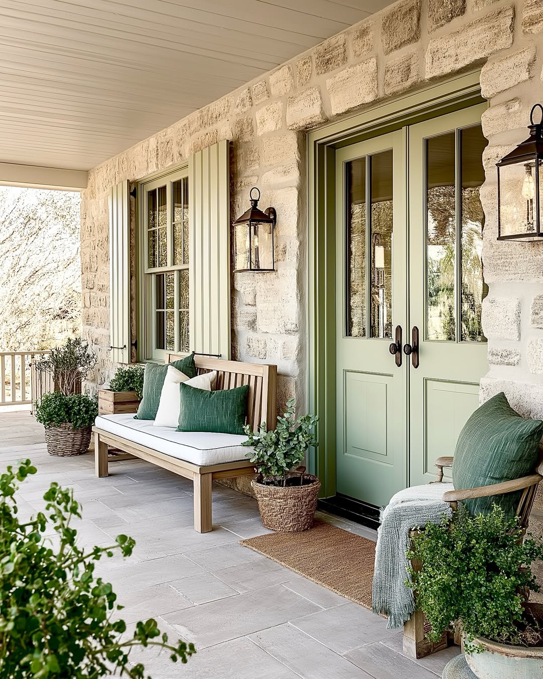 Limestone walls and soft sage green make the case for calming curb appeal. Layered textures—from the woven planters to the slatted bench—turn the porch into a full-blown retreat. Green pillows echo the shutters and door, creating harmony without trying too hard. Every element whispers relaxation with a hill country accent.