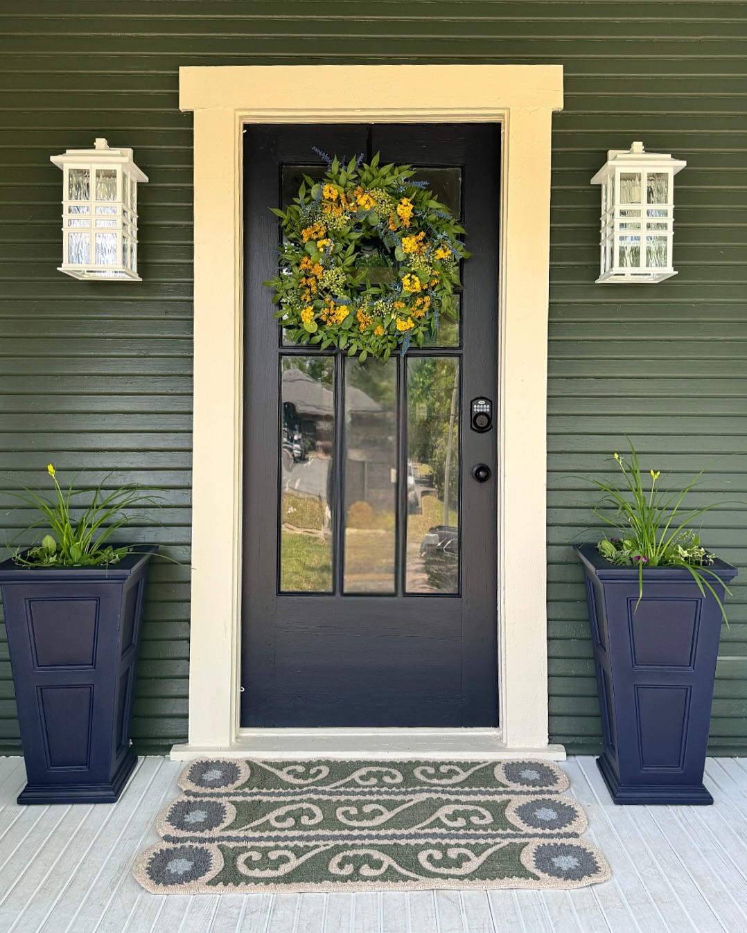 Deep green siding sets a moody backdrop, but it’s the sharp contrasts that steal the show. A bold black door, trimmed in cream, feels fresh and intentional—not fussy. Flanking lanterns and twin navy planters add symmetry, while the yellow floral wreath brings a sunny pop. Even the layered rug pulls its weight, tying in pattern without competing for attention.