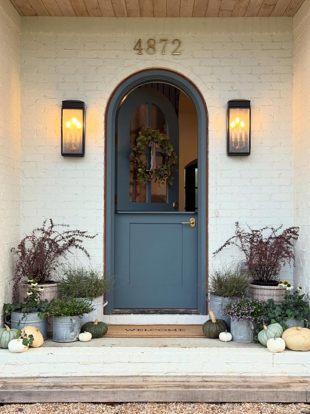 Arched doors have a way of charming everyone—and this blue beauty nails it. Set against creamy painted brick, it strikes a soft contrast that feels both cozy and elevated. Galvanized containers packed with grasses, gourds, and fall foliage create a low, layered look that hugs the entry. The brass latch and muted wreath seal the deal: rustic, but never rough.