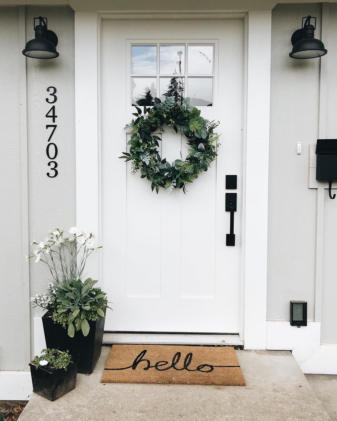No frills, just friendly. This white paneled door and black hardware combo hits the modern farmhouse sweet spot. A fresh green wreath adds just enough softness, while the vertical house numbers and matte sconces keep things graphic. Bonus points for the “hello” mat—because even minimalists can be warm.