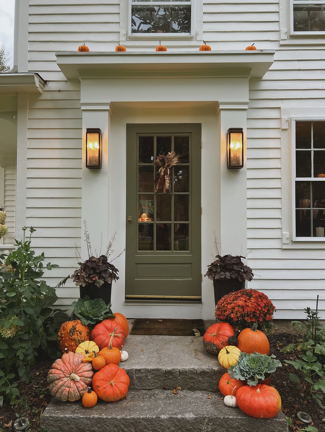 This entry’s going full harvest mode—and we’re here for it. A sage green door and crisp white trim set a timeless backdrop for the wild riot of pumpkins below. From bumpy heirlooms to smooth minis, the mix adds texture and personality in all the right ways. Don’t miss the subtle lineup of pumpkins on the roof ledge—yes, even the top step gets in on the fun.