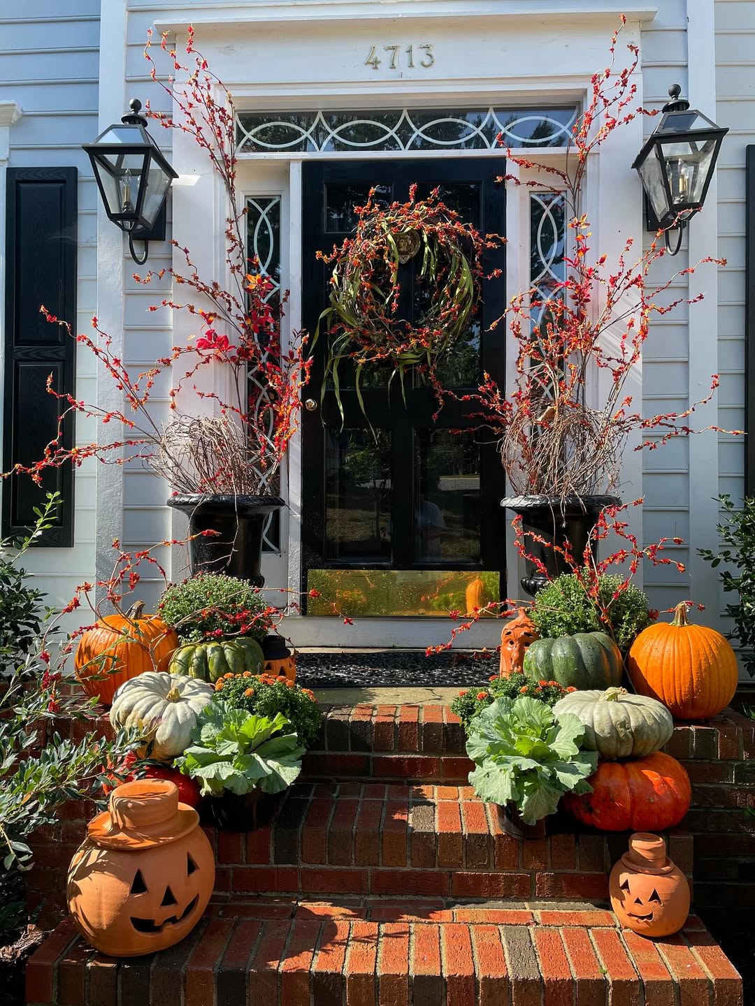 This porch doesn’t whisper fall—it shouts it with flair. Twisting branches in tall urns bring height and movement, framing the glossy black door like a theatrical curtain. A sculptural wreath and bold mix of pumpkins, cabbage, and mums turn the brick steps into a layered autumn stage. And those cheeky jack-o’-lanterns? Just the right amount of spooky charm.