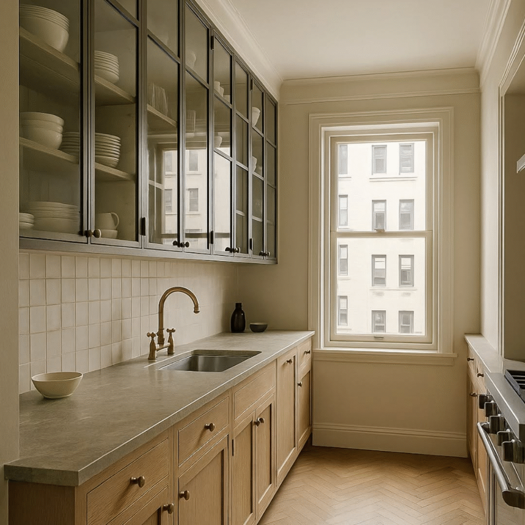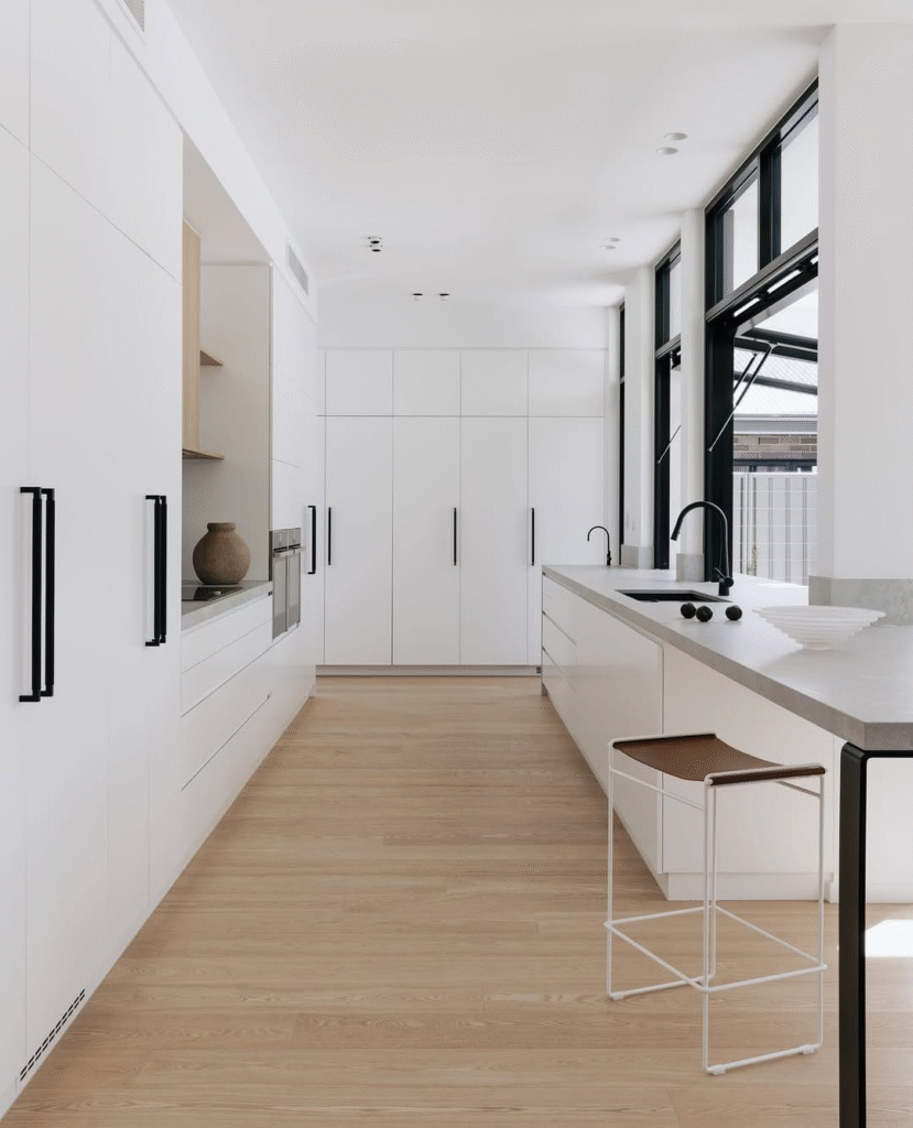 “Light colors make a space feel bigger and airier, which is crucial for galley kitchens. Opt for soft whites, light grays, or pastels to expand the space visually and reflect more light.