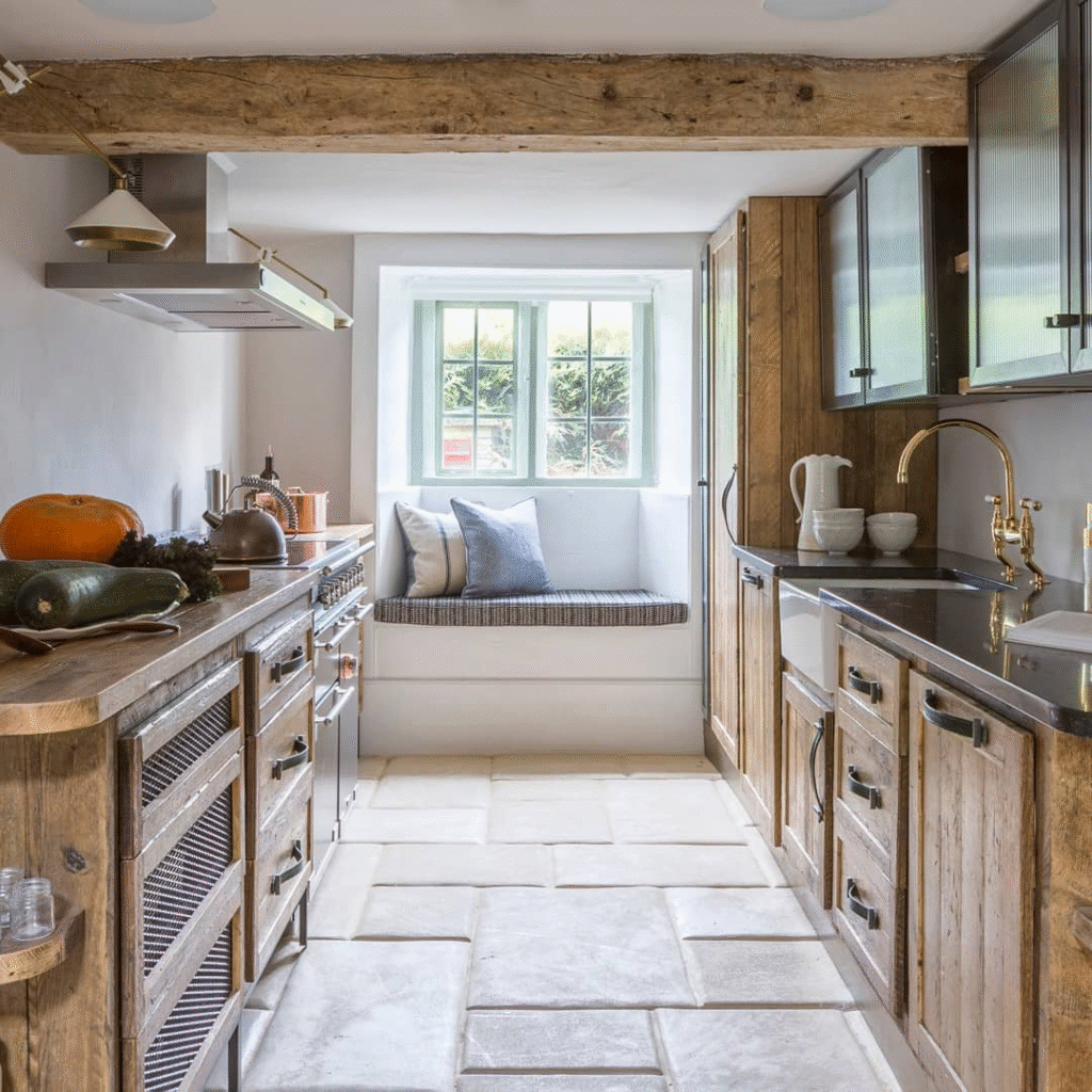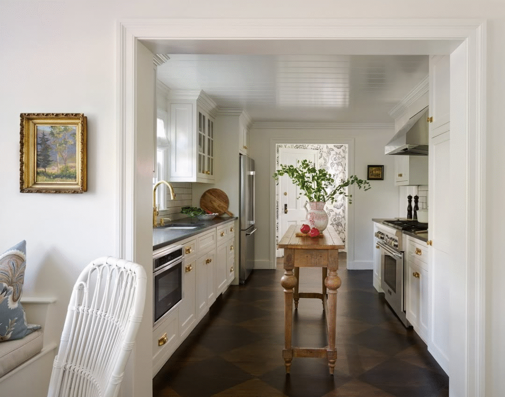 This galley kitchen idea brings that delightful rustic charm into your cooking space. With its whimsical floral patterns, vintage-inspired fixtures, and adorable farmhouse sink, it’s like stepping into a fairy tale.