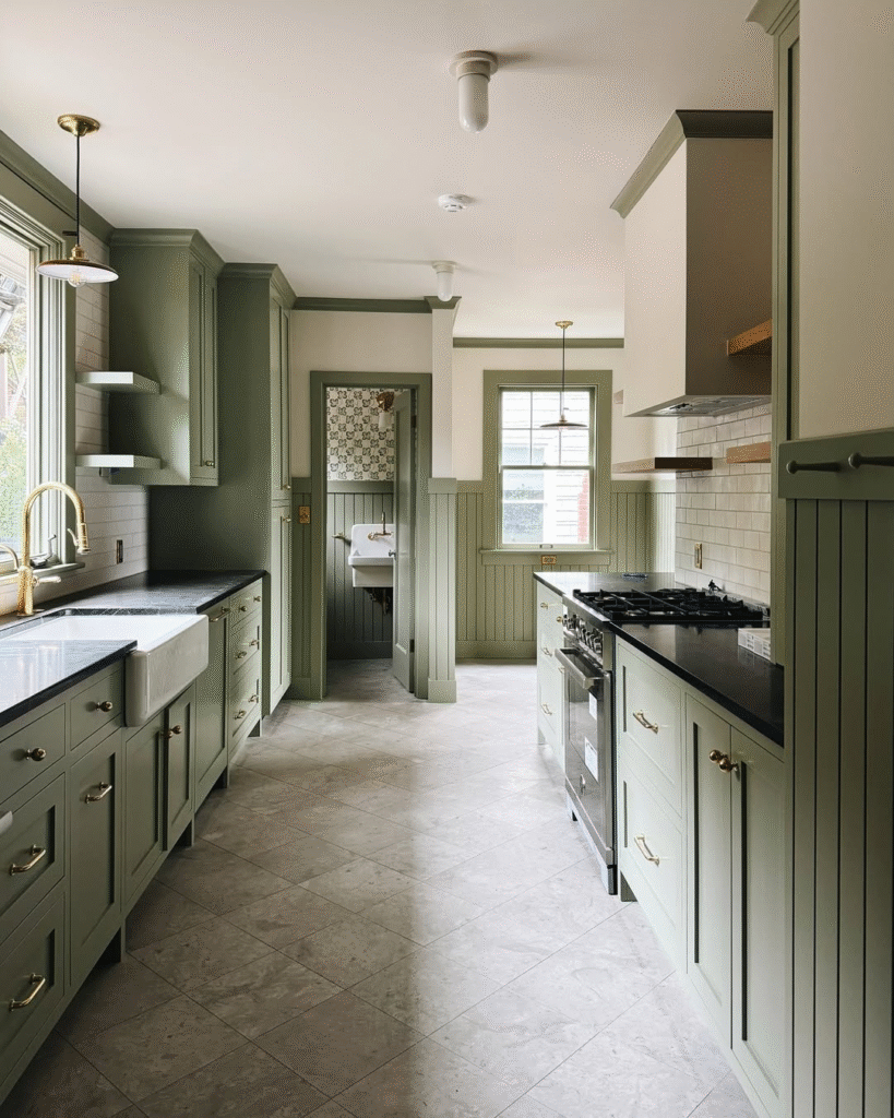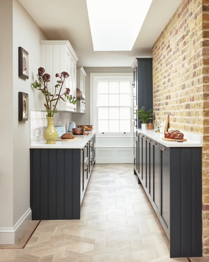 This galley kitchen idea is all about wooden flooring and a shiplap backsplash, bringing you the best of both worlds. It’s like a stylish wooden hug for your kitchen, adding texture and character to make your guests swoon with envy.