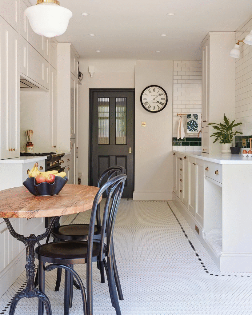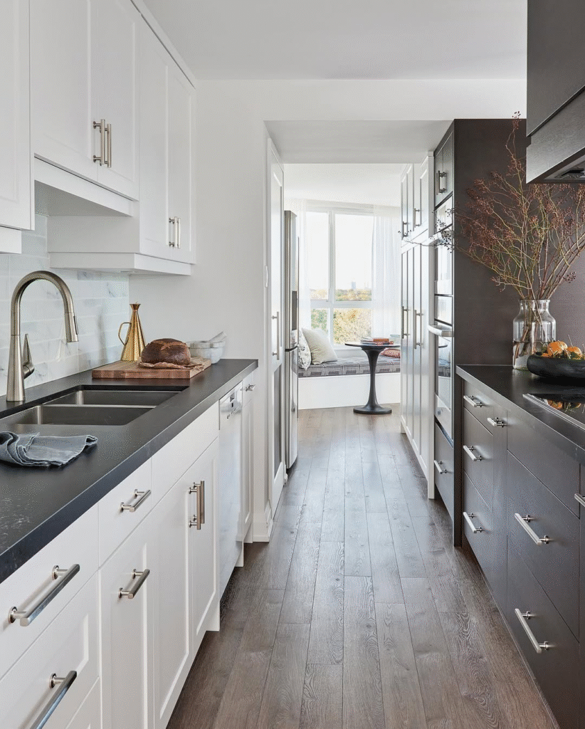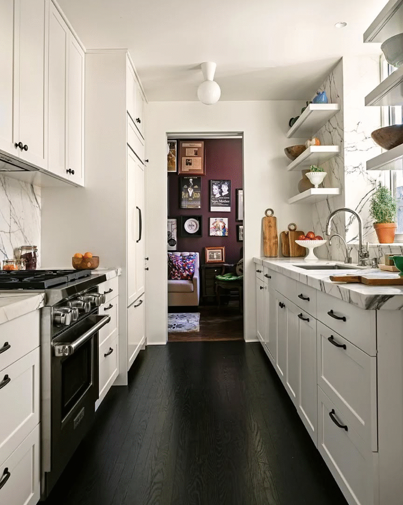 Behold, the yin, and yang of galley kitchen design! In this quirky idea, we bring you the ultimate contrast: white cabinets with black hardware. It’s like a stylish dance-off between light and dark, where the cabinets say, “Look at me, I’m pure and pristine!” while the black hardware adds a touch of rebel attitude.