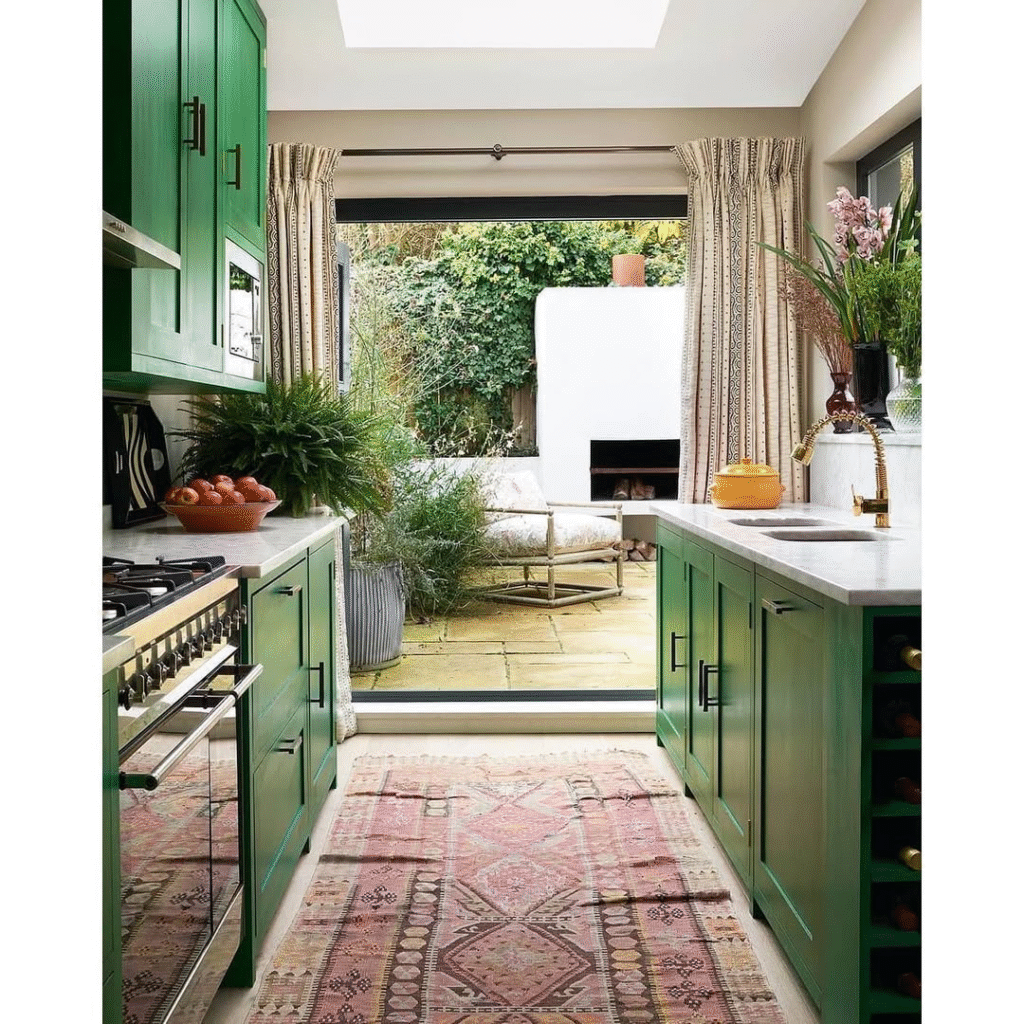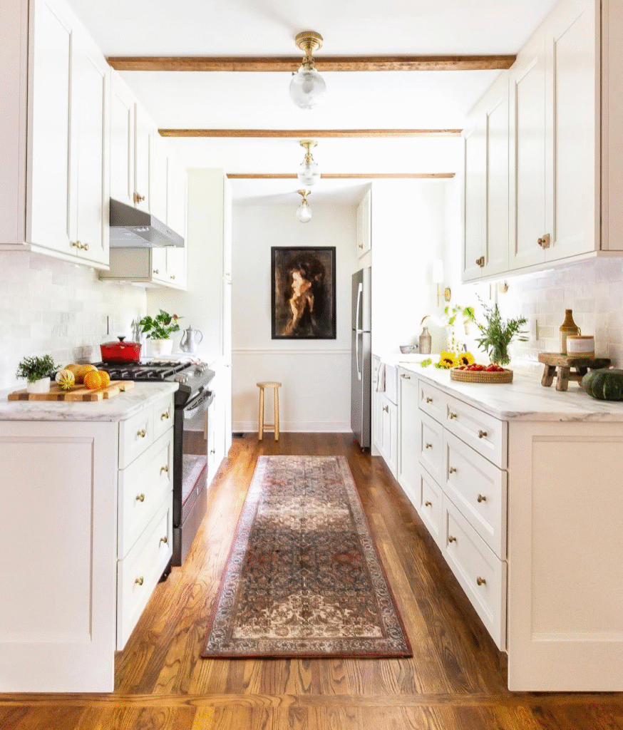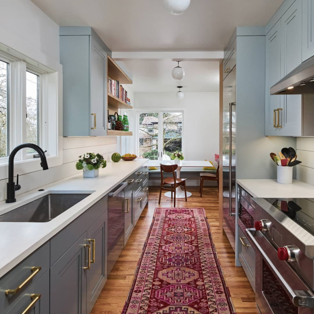 Revamp your modern galley kitchen with a surprising twist – a vintage rug! Who says you can’t mix old and new? So step into the time machine and add a touch of whimsy to your sleek culinary space.