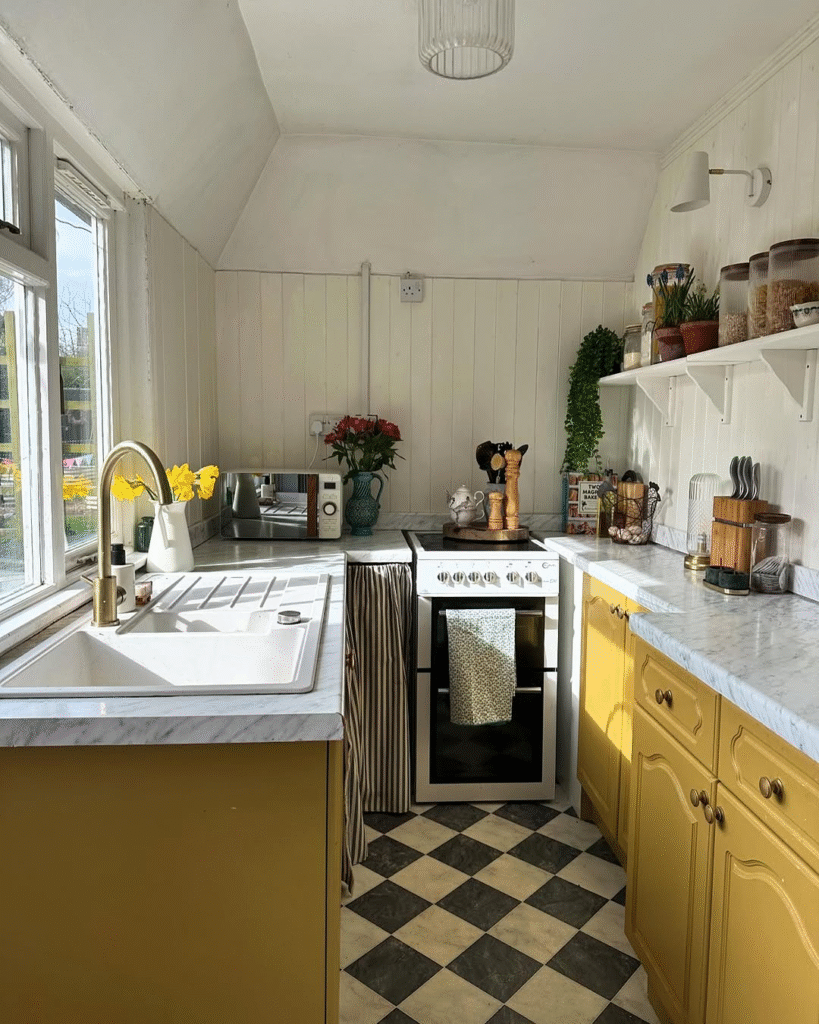 Who needs boring old cabinets when you can have a galley kitchen that’s straight out of a charming country house? Introducing the genius idea of using curtains instead of cabinets! It’s like a culinary fashion show every time you step foot in the kitchen.