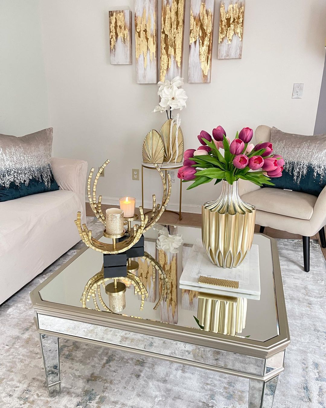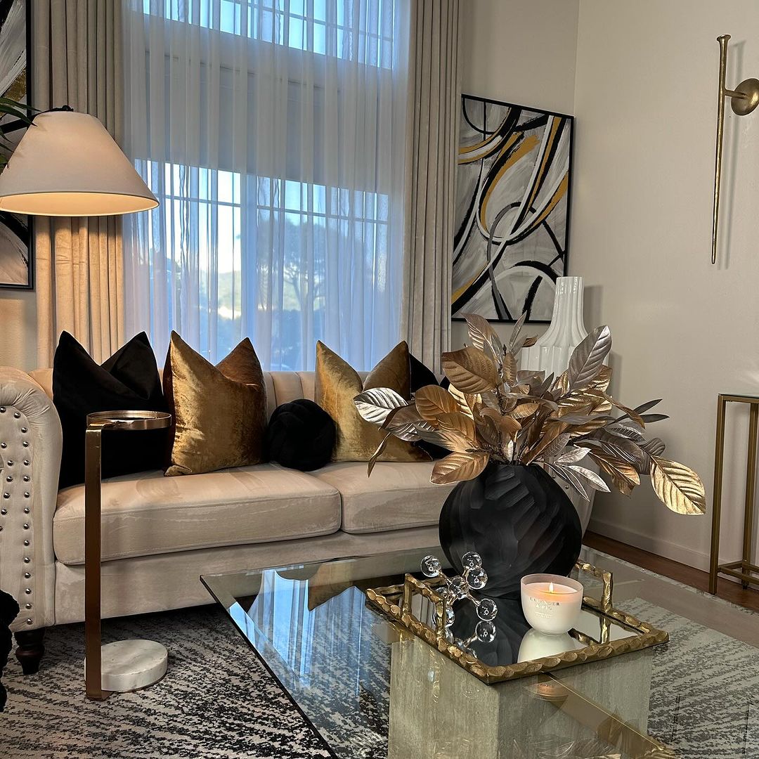 Introduce a golden touch with a sculptural centrepiece, creating a focal point on the glass table. Pair it with a vibrant bunch of tulips in a sleek vase, injecting colour and life. Strategically place candles for a warm ambiance, harmonising with the metallic accents.