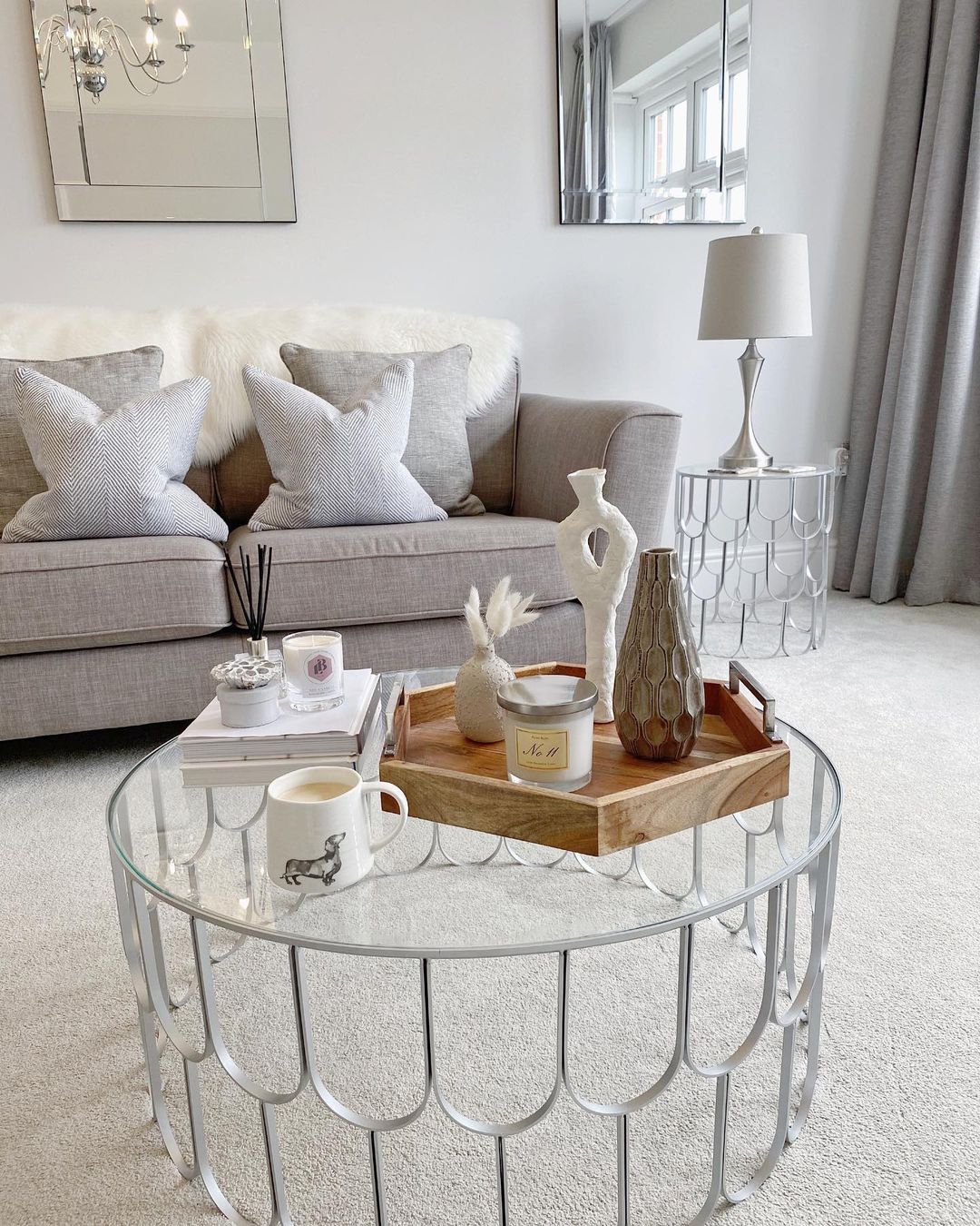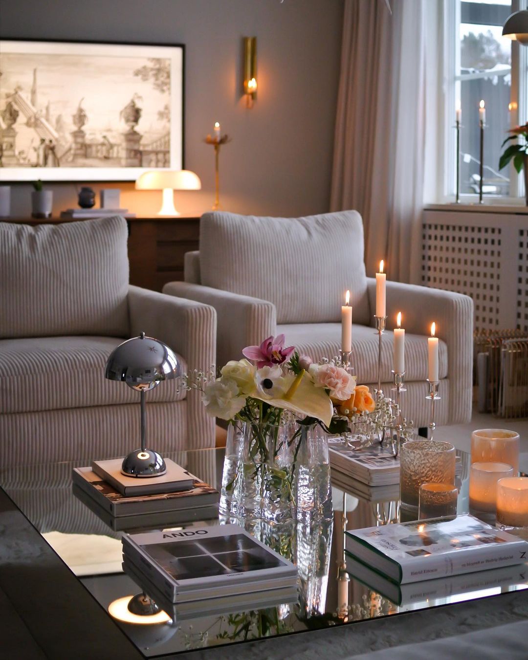 Embrace tranquillity with a glass coffee table illuminated by candlelight. Place a mirrored tray beneath to double the warm glow. Add a touch of elegance with a modern silver lamp and a vase of fresh flowers. This setup creates a peaceful retreat, perfect for evening relaxation.