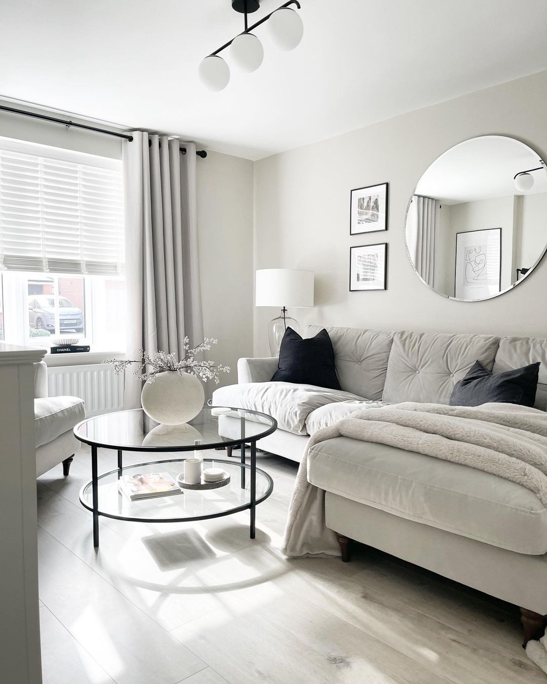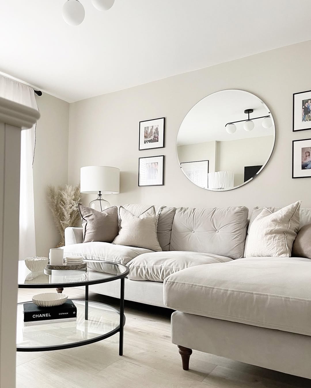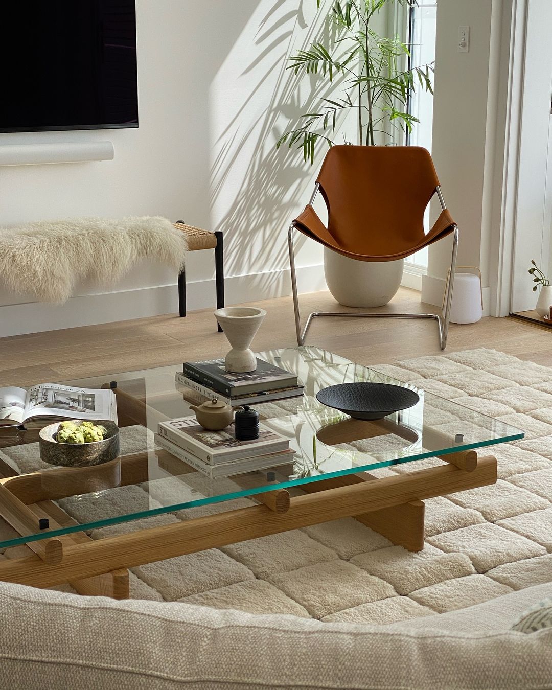 Glass coffee tables love a curated moment, and this one nails the brief. A Chanel book grounds the lower shelf while sculptural bowls and a candle tray float effortlessly above. It’s all about layering textures—ceramic, paper, glass—without adding visual clutter. The neutral palette keeps it calm, but the styling still feels intentional.