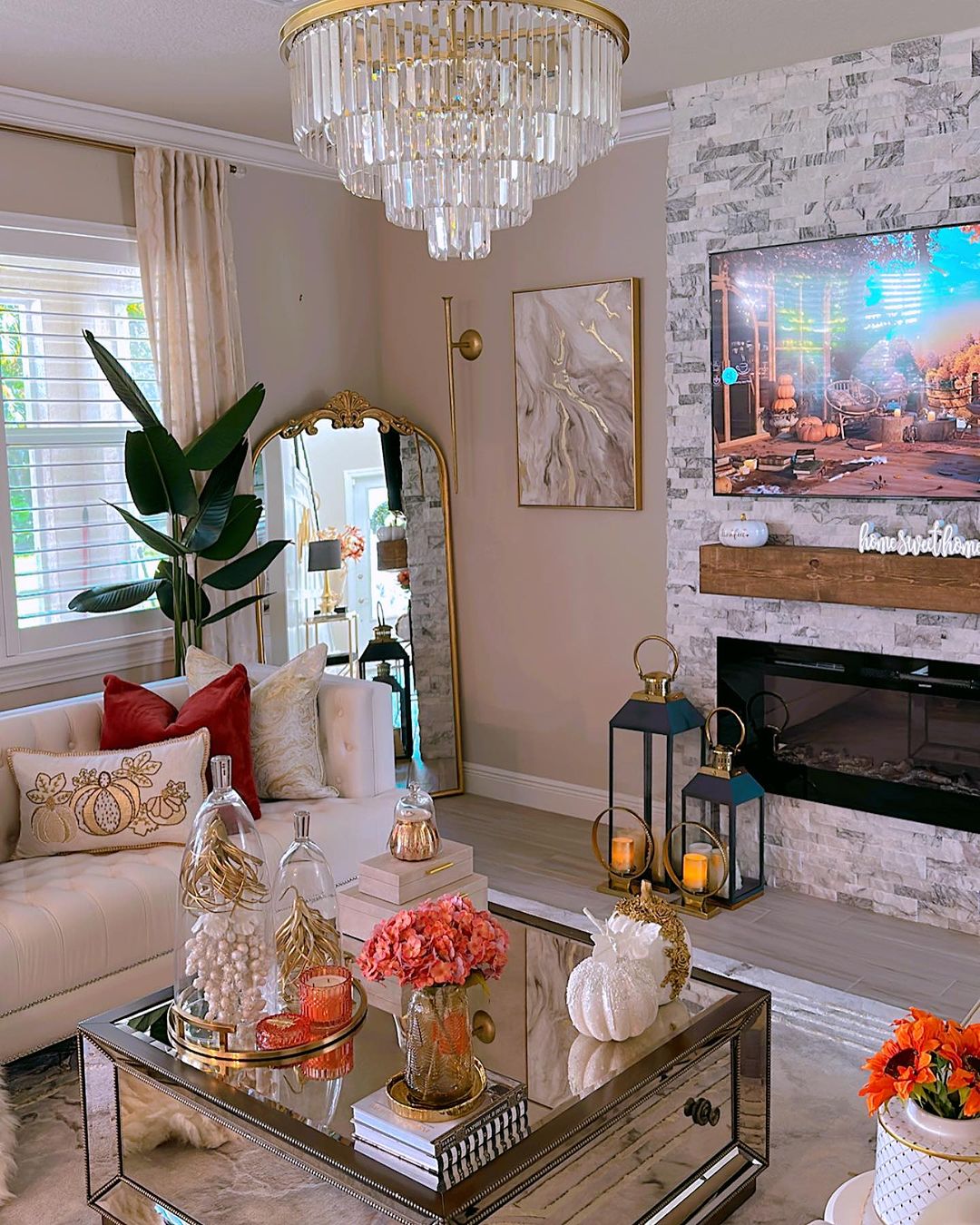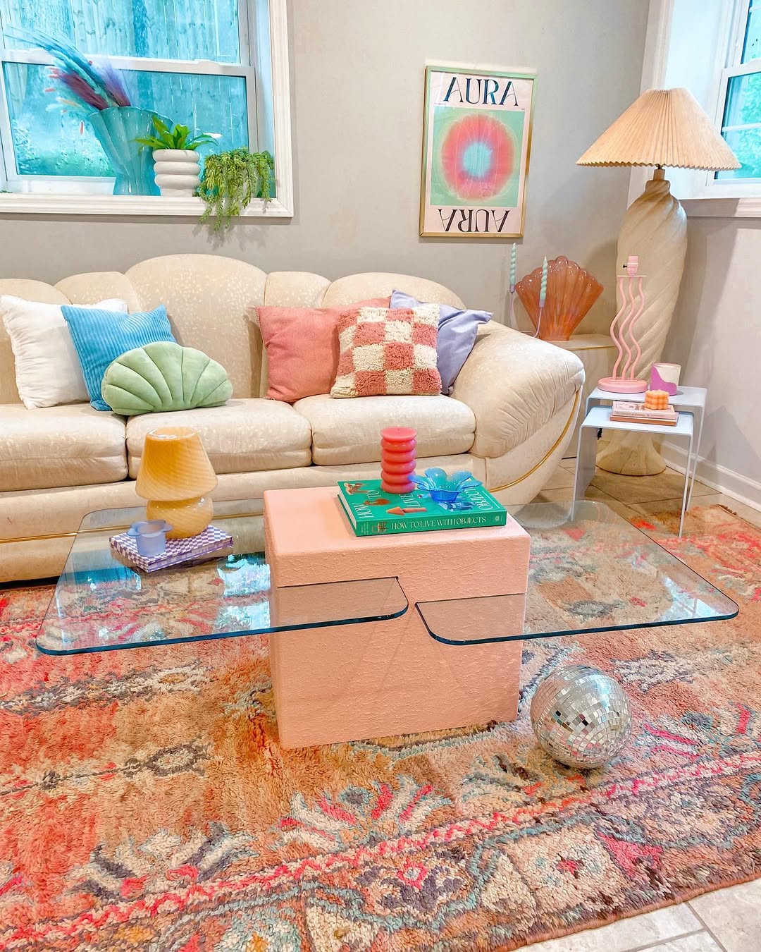 This glass coffee table doesn’t just host decor—it hosts a party. Bright stacked candles, pastel ceramics, and a cheeky disco ball play off a plush peach base like toppings on a sundae. The key here is contrast: slick glass meets fuzzy textures, retro lines meet modern whimsy. It’s maximalism that doesn’t feel messy, thanks to tonal cohesion and lots of breathing room.