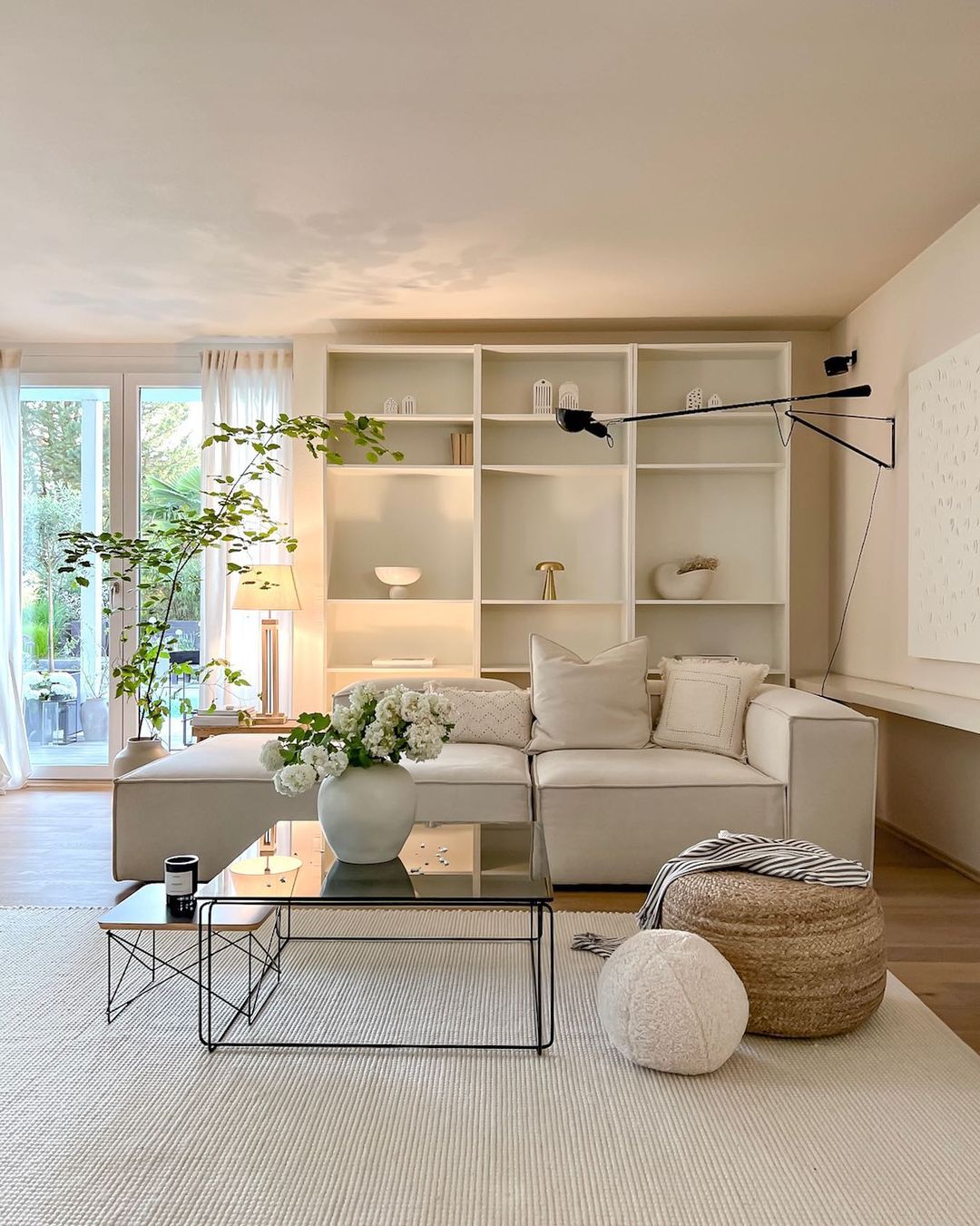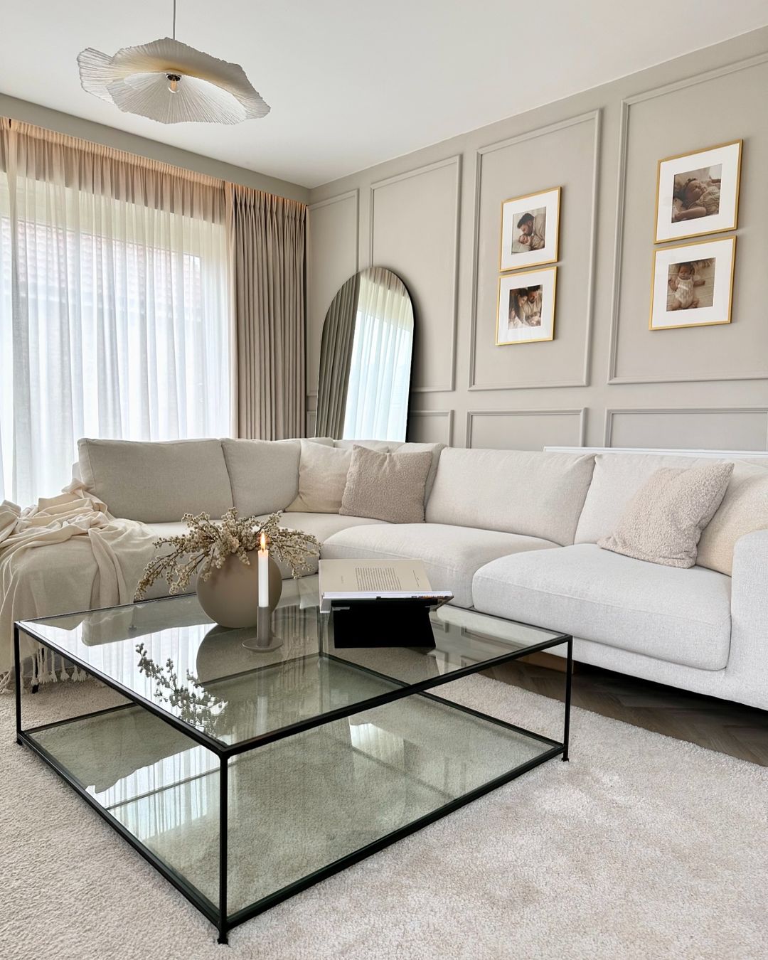 A black-framed glass coffee table grounds the living space, complemented by an elegant vase, book holder and simple candle. The reflection on the table’s surface amplifies the room’s open, airy feel. Paired with neutral tones and soft textiles, it creates a timeless setting that is both modern and inviting.