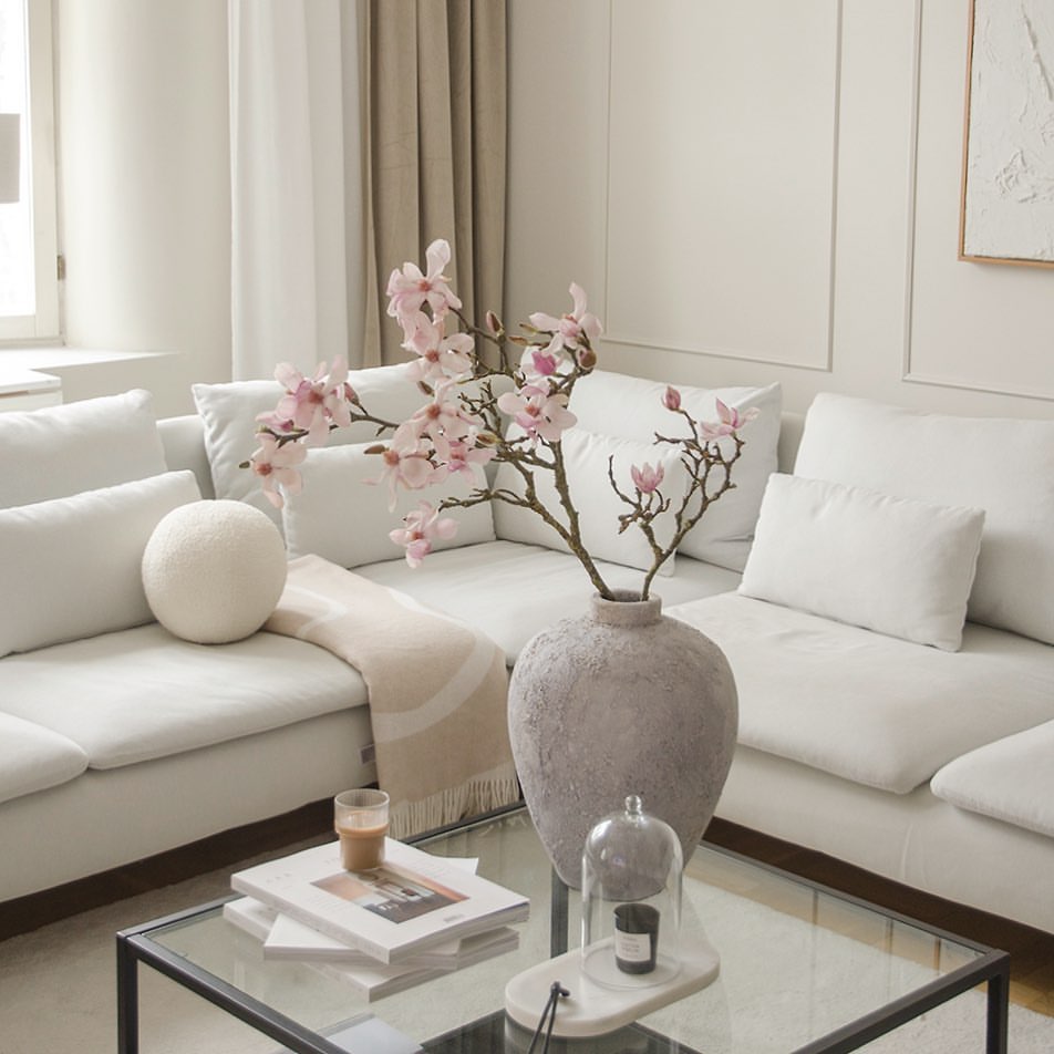 Foster a serene environment with a delicate arrangement of pink blossoms on a sleek glass coffee table. The rustic charm of the vase contrasts with the table’s modernity, creating a balanced aesthetic. Accompanied by a small stack of books and a solitary candle, the space is an ode to tranquil simplicity, ideal for unwinding.